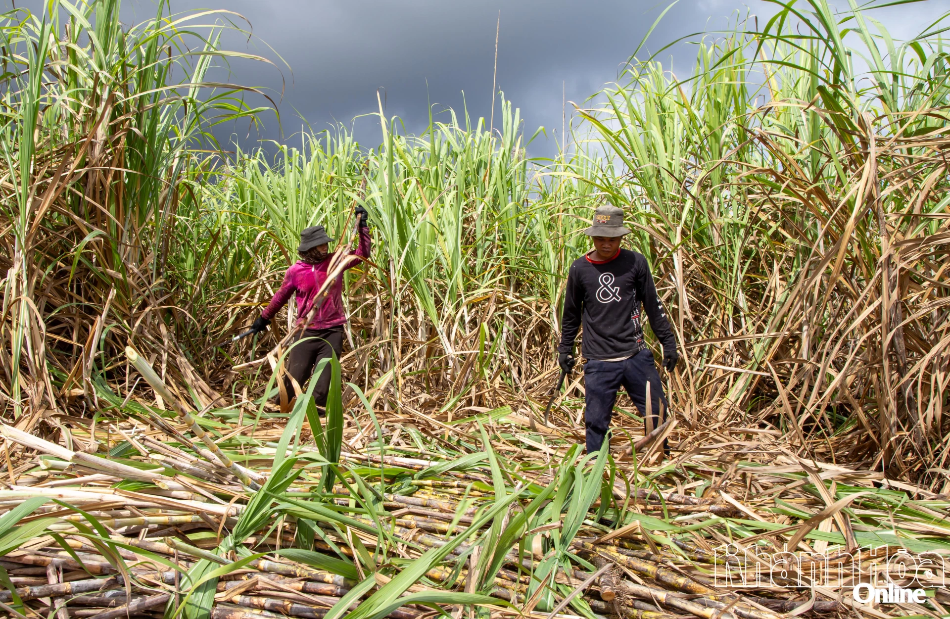 Cách rẫy mía nhà ông Cường không xa, một nhóm nhân công đang thoăn thoắt thu hoạch. Chúng tôi gặp bà Nguyễn Thị Thủy - trưởng nhóm gần 38 lao động đến từ tỉnh Vĩnh Long, theo mùa mía ra đây chặt mía thuê cho biết. Mỗi ngày cả đội chặt hơn 1ha mía, tương đương 70 đến 80 tấn mía. Thu nhập mỗi người đạt khoảng 350.000 - 400.000 đồng/ngày. “Cực nhưng có việc làm là vui. Hết mùa mía, chúng tôi lại về quê làm dừa”, bà Thủy chia sẻ, tay vẫn thoăn thoắt. Mía được mùa mang niềm vui đến không chỉ cho người trồng, mà còn lan sang cả người đi làm thuê. “Mía được mùa, được chữ đường, ai cũng vui. Chúng tôi thu hoạch xong còn được người thuê thưởng thêm một ít. Bữa ăn nửa buổi cũng tươm tất hơn”, một nhân công chặt mía bộc bạch.