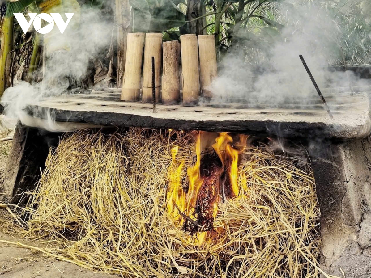 Dưới lớp khói rơm, những ống tre vừa có tác dụng diệt khuẩn, vừa tạo nên hương vị thốt nốt truyền thống không thể lẫn vào đâu được.