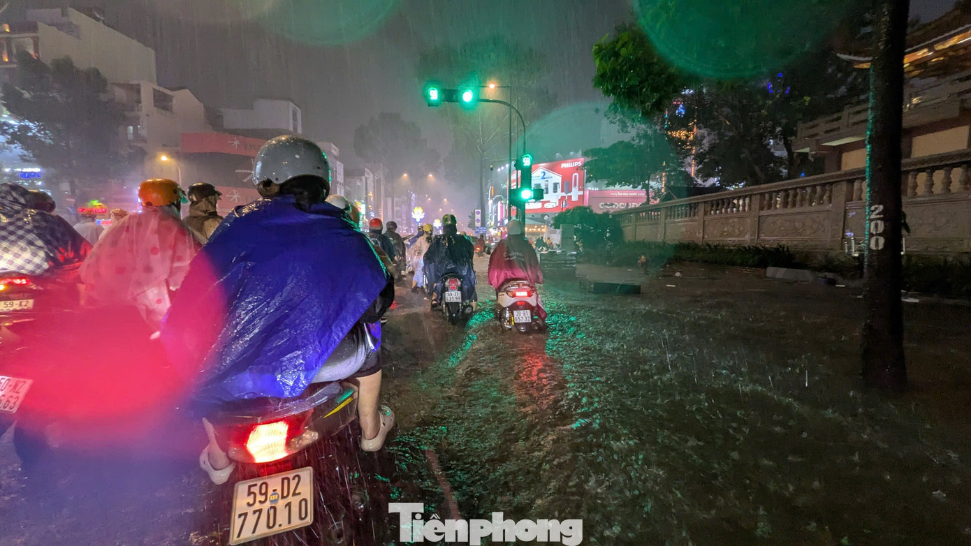 Từ khoảng 18h, mưa lớn xuất hiện trên diện rộng tại nhiều khu vực TPHCM, kéo dài hơn một giờ đồng hồ. Đáng chú ý, mưa trút xuống đúng thời điểm triều cường khiến nước thoát không kịp, gây ngập cục bộ trên nhiều tuyến đường.