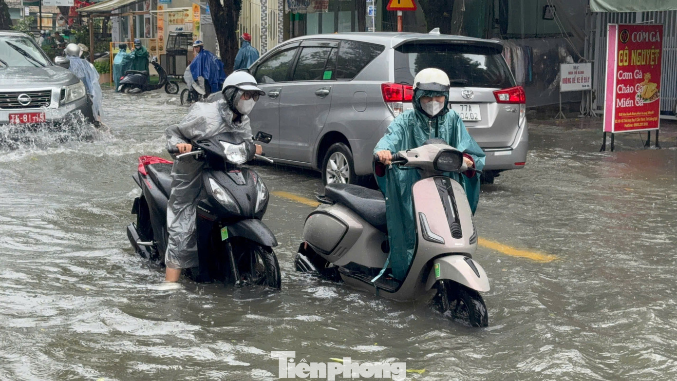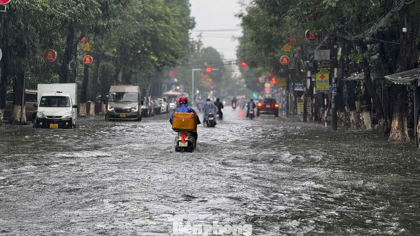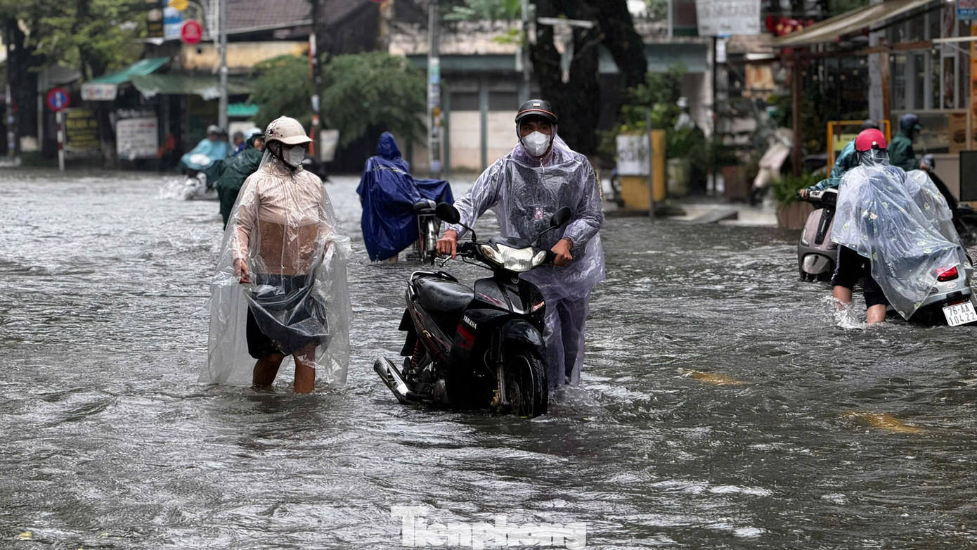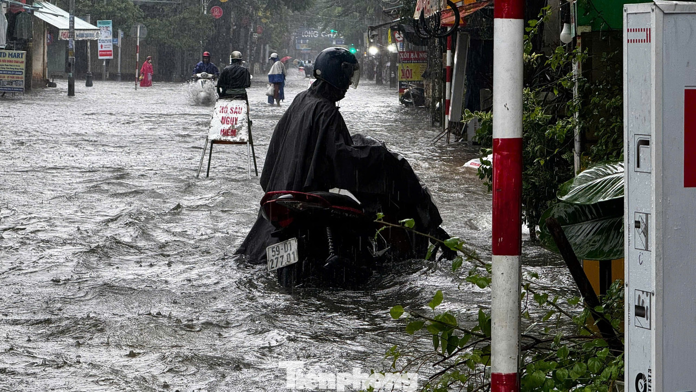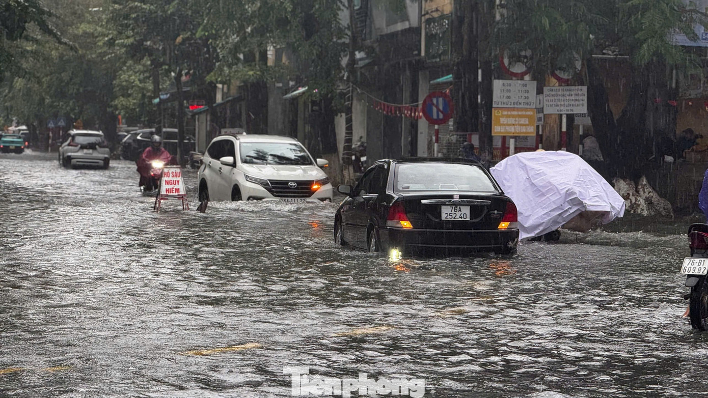 Tuyến đường Phan Bội Châu giao với Trần Hưng Đạo nhiều đoạn nước ngập sâu lút đầu gối. Nhiều phương tiện bị chết máy giữa đường.