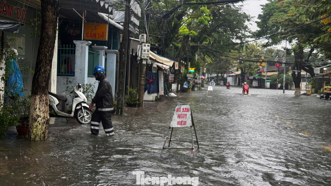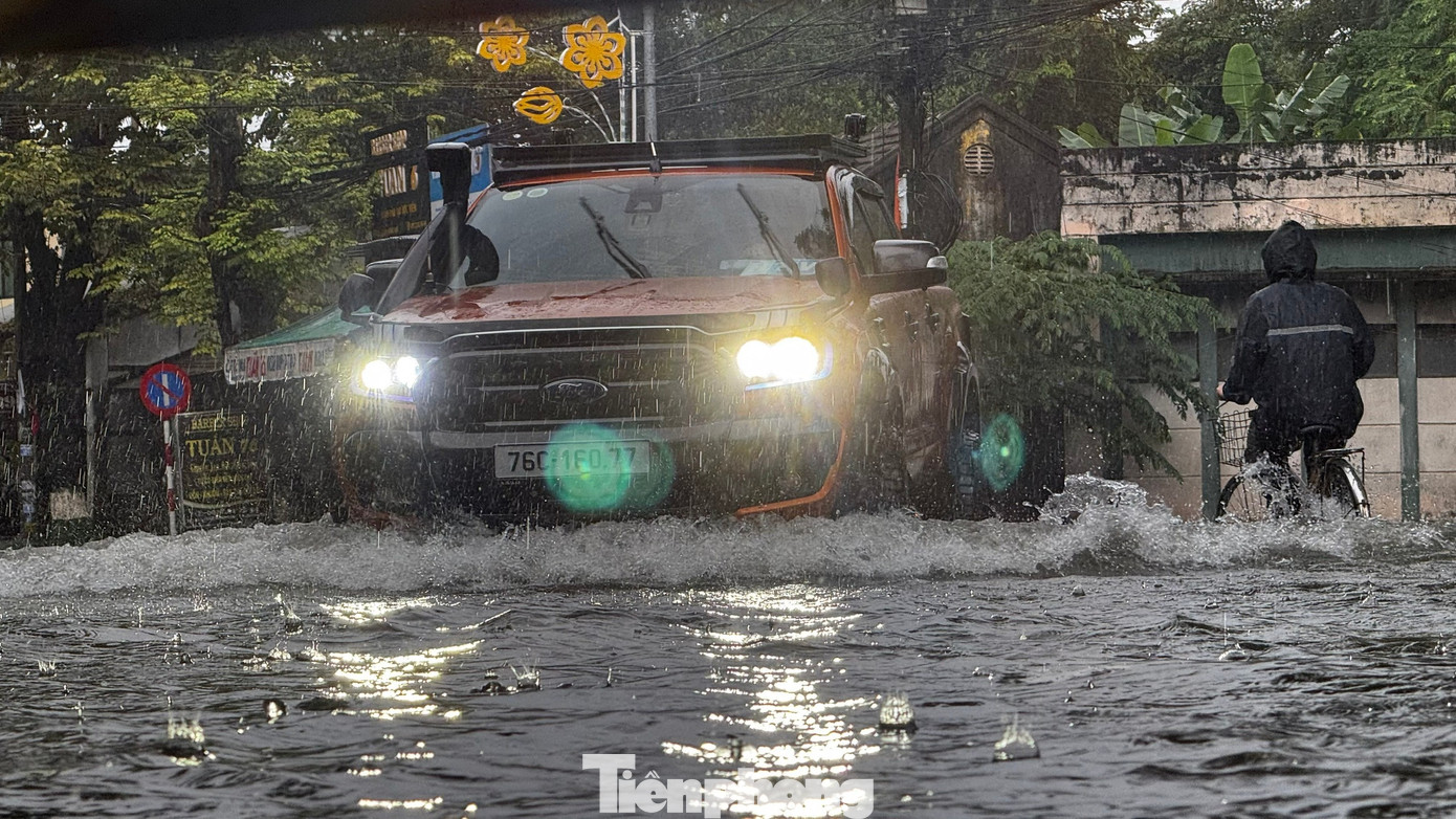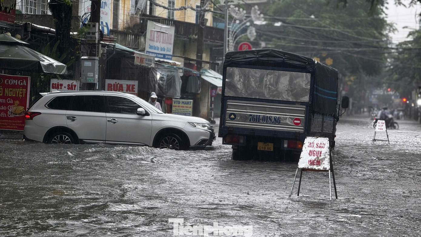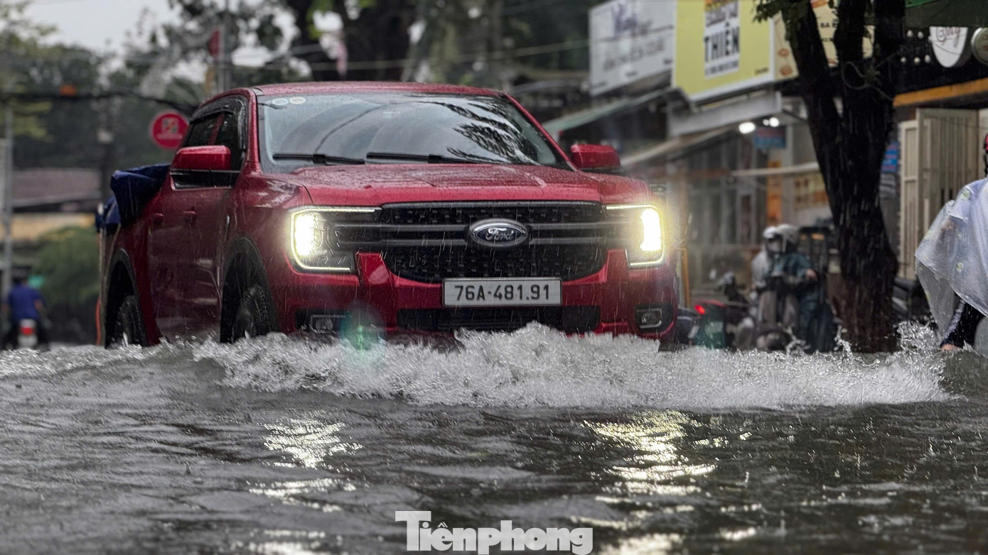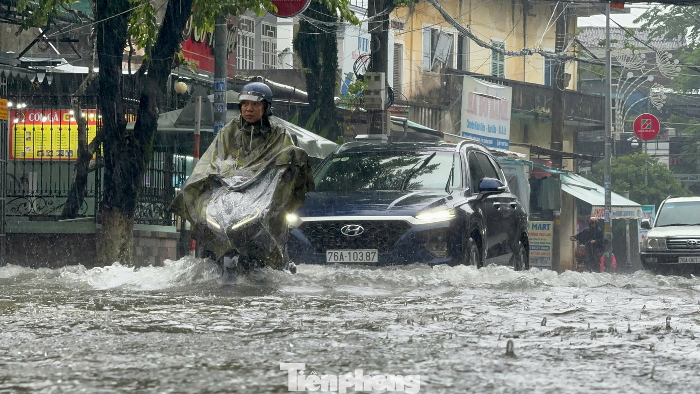 Những cơn mưa lớn và kéo dài khiến nhiều tuyến đường ở đô thị trung tâm tỉnh Quảng Ngãi bị ngập sâu, có nhiều đoạn ngập sâu nửa mét, chính quyền đã phải giăng dây cấm phương tiện lưu thông.