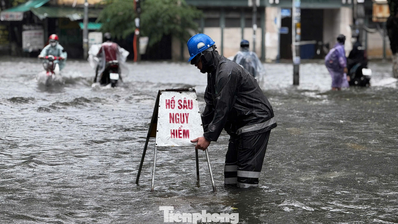 Lực lượng chức năng đặt biển báo nguy hiểm ở các khu vực ngập sâu.
