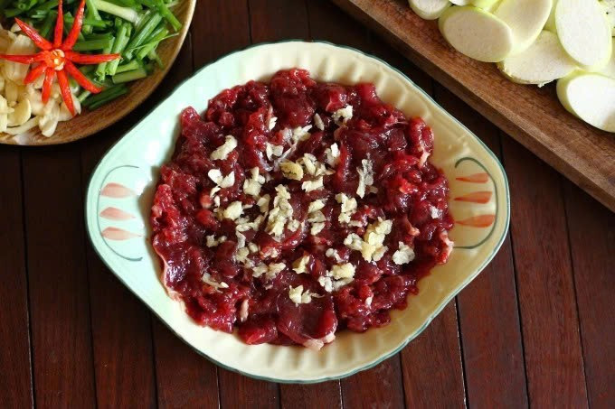 Thịt bò thái ngang thớ, ướp với dầu hào, hạt nêm, tỏi băm và chút bột năng để khi xào mềm và thấm vị. Ảnh minh họa