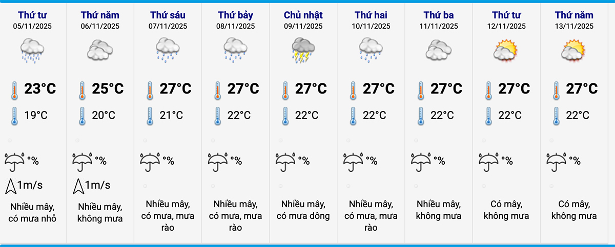 Ngày 5/11, khu vực này mưa nhỏ, nhiệt độ trong ngày tăng nhẹ, dao động 19-23°C. Thời tiết Hà Nội tạnh ráo hơn trong ngày 6/11, nhiệt độ cao nhất tăng lên 25°C, thấp nhất 20°C.