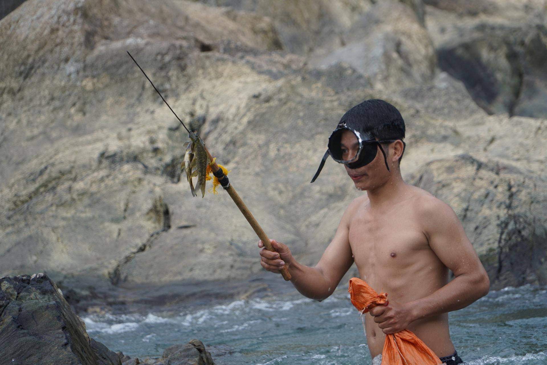 “Đầu năm nước cạn, trời nắng ráo, cá niên thường bơi ra khe đá tìm rong rêu ăn. Lúc này dễ săn nhất”, anh Thể chia sẻ trước khi ngụp lặn xuống làn nước lạnh. Chỉ vài phút sau, anh nổi lên, trên tay là con cá niên còn ánh bạc.