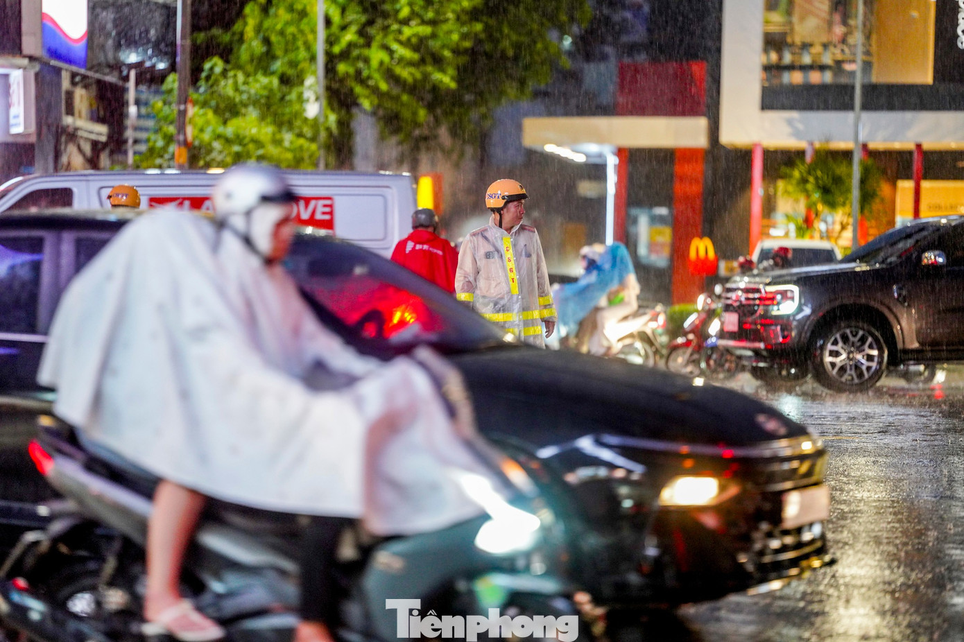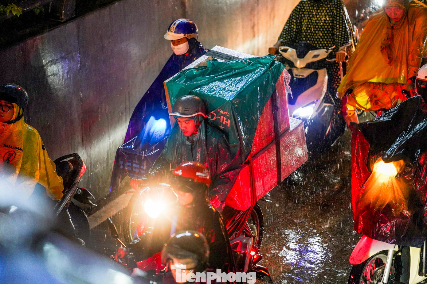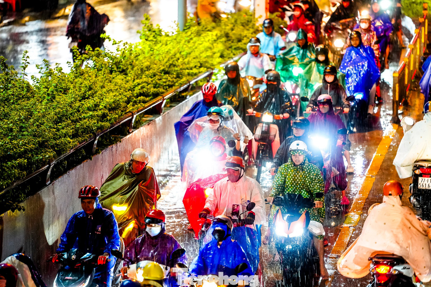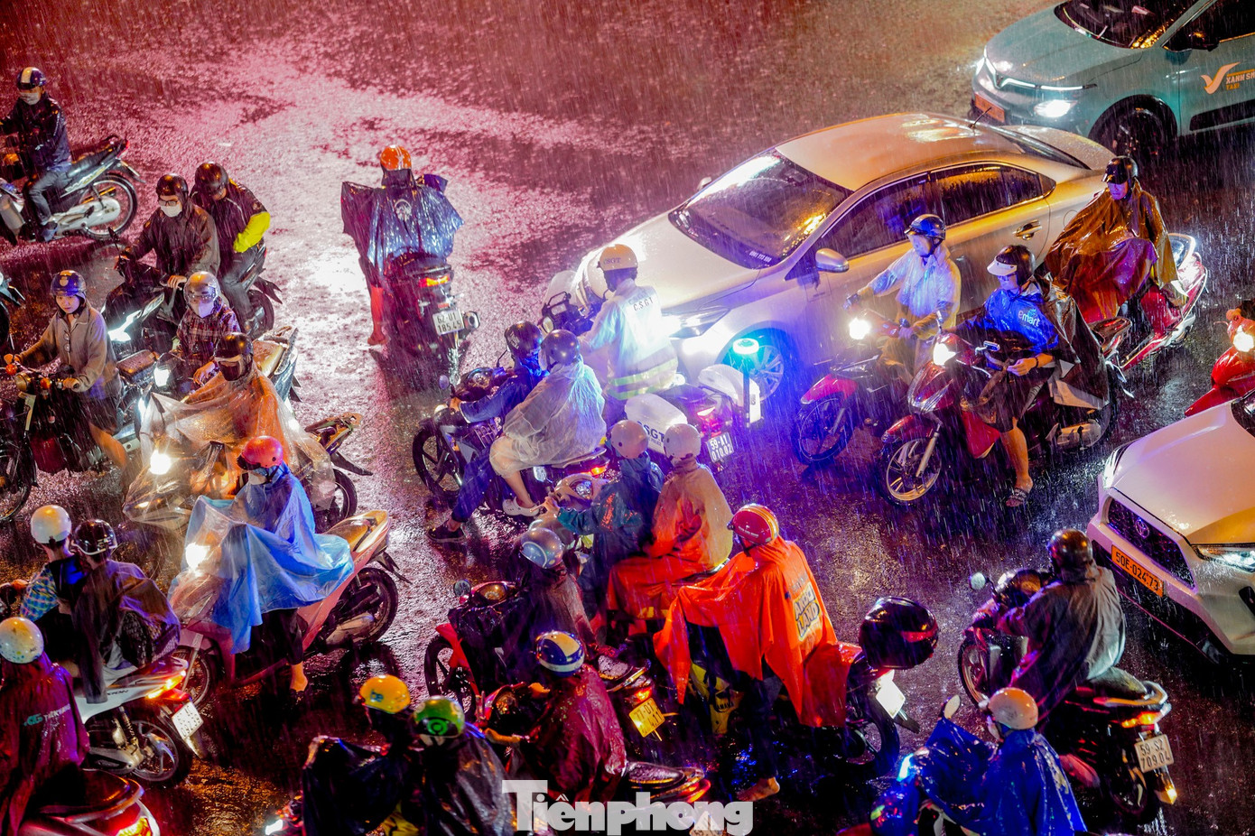 Dòng phương tiện ken đặc giữa cơn mưa tầm tã.