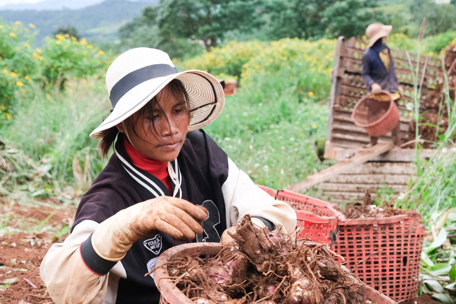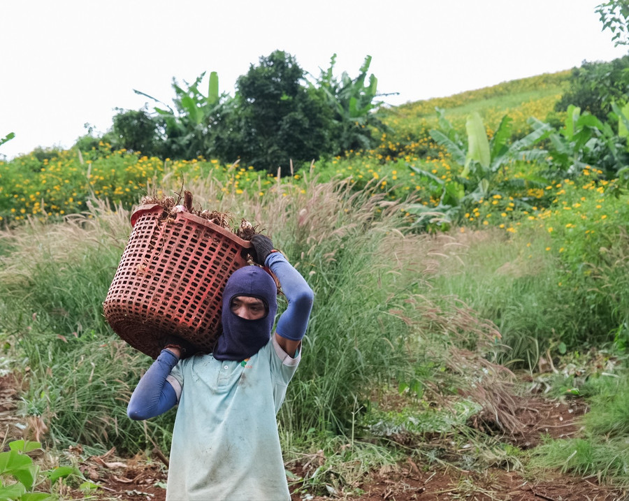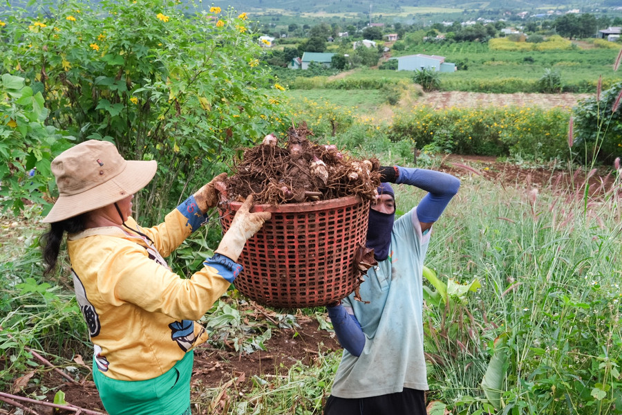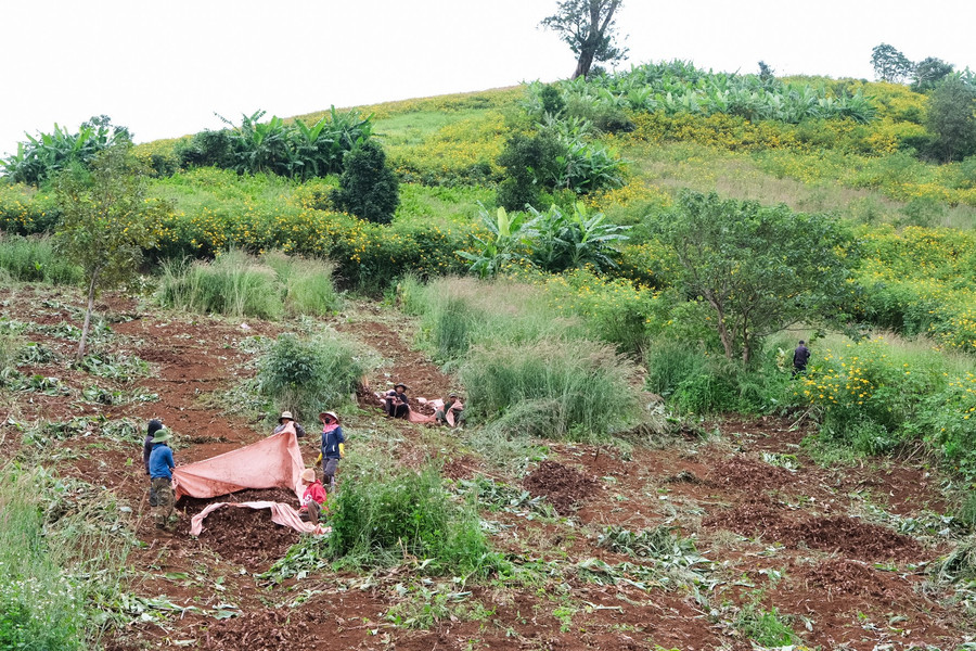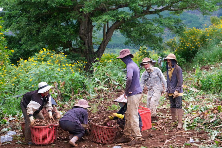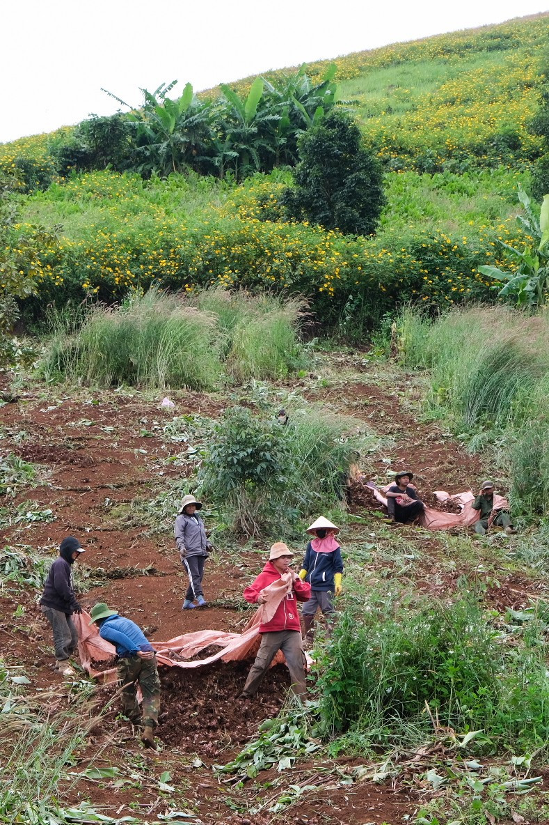 Công việc thu hoạch nơi sườn núi lửa không hề nhẹ nhàng. Đất núi dốc, củ nằm sâu, ai nấy đều phải khom mình bổ mạnh từng nhát cuốc. Thế nhưng trong cái vất vả ấy vẫn ánh lên niềm vui, khi từng củ dong được rũ sạch đất, gom đầy vào tấm bạt lớn, rồi được những thanh niên khỏe mạnh kéo xuống chân núi theo triền dốc quanh co, giữa biển hoa vàng rực rỡ.