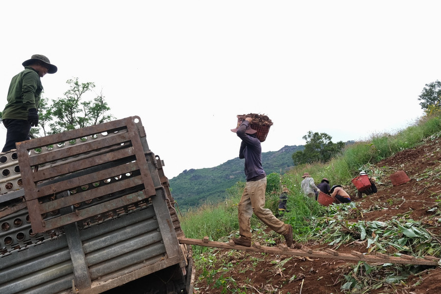 Canh tác trên sườn núi nên việc thu hoạch dong riềng khá vất vả. Ảnh: Minh Châu