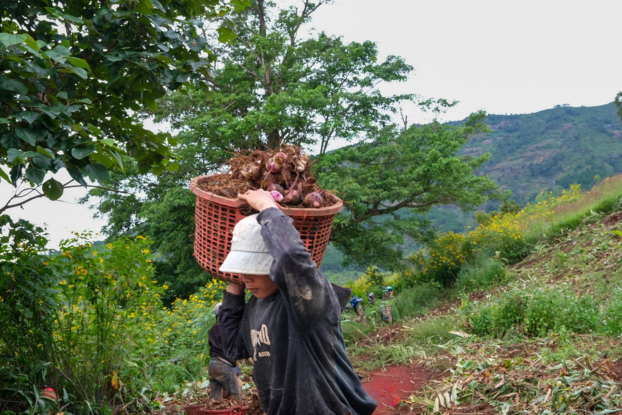 Những củ dong riềng được rũ sạch đất đỏ rồi đưa xuống núi. Ảnh: Minh Châu