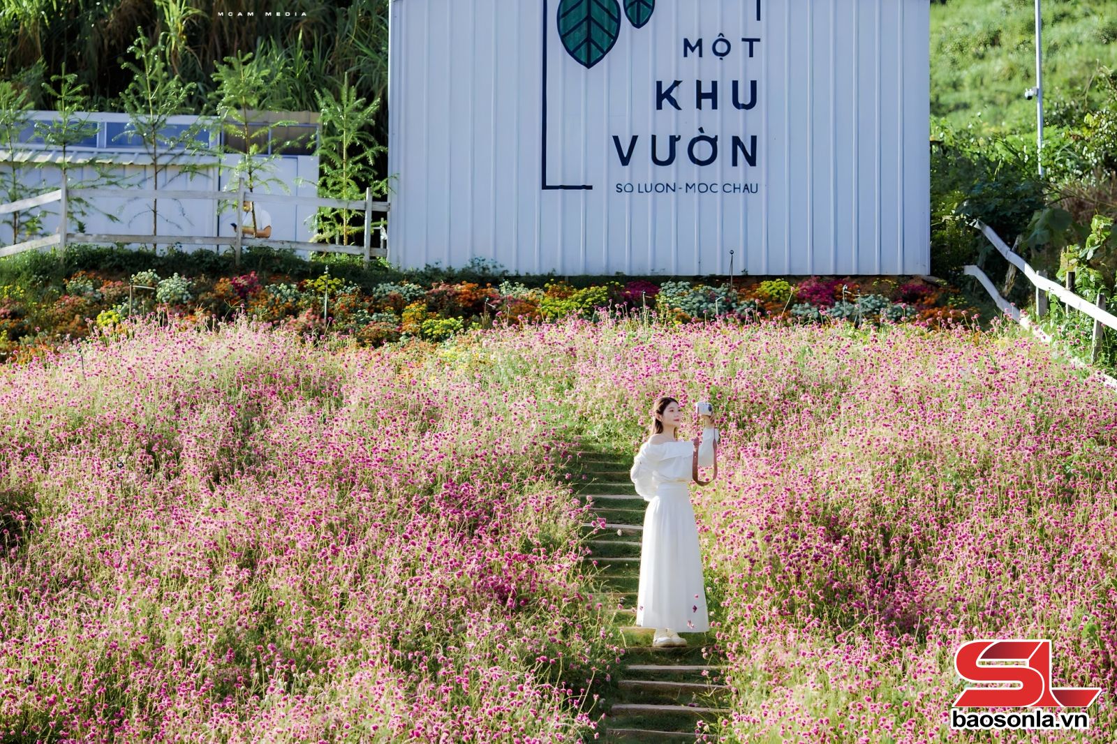 Không chỉ nổi bật với sắc màu và hương vị của những trái hồng, thời điểm này, đến với bản Sò Lườn, xã Chiềng Sơn, giữa không gian xanh ngát, bao la của núi rừng, triền đồi rực rỡ sắc màu các loài hoa của quán cà phê "Một khu vườn" cũng thu hút đông đảo các bạn trẻ đến tham quan, trải nghiệm, lưu giữ lại những bức ảnh đẹp nơi đây. Tận dụng địa hình thung lũng rộng và thoáng đãng, chủ vườn đã khéo léo chia thành nhiều khu vực trồng các loại cây, hoa giúp du khách có nhiều lựa chọn góc chụp ảnh; đồng thời, trang trí thêm nhiều tiểu cảnh nho nhỏ, xinh xinh, hài hòa với cảnh vật. Từ bờ rào trắng xinh, những chiếc ghế nhỏ đặt giữa đồi cho đến không gian cà phê đẹp, tất cả đều góp phần mang đến một khung cảnh đầy lãng mạn cho du khách.