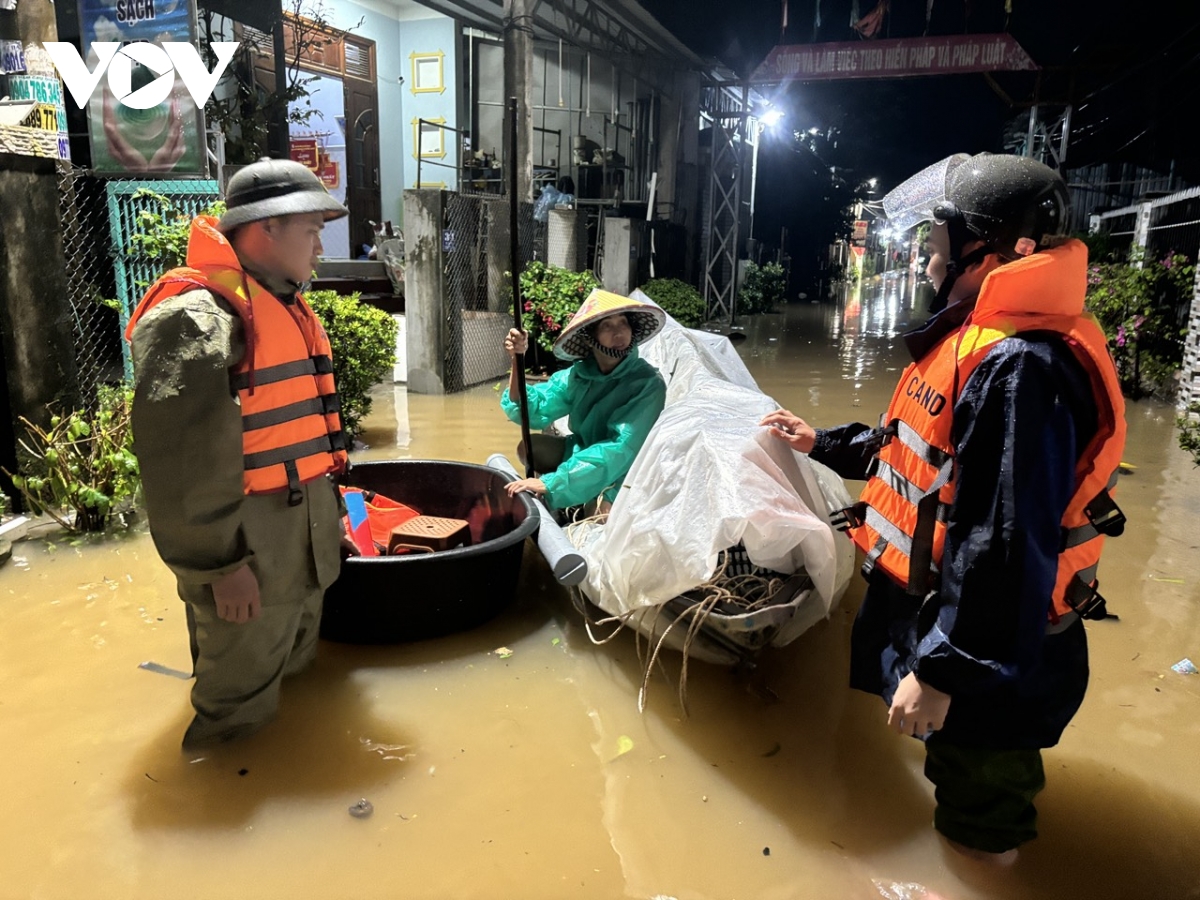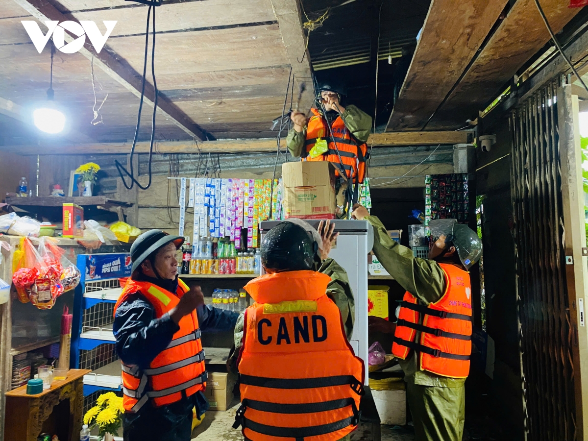 Bên cạnh việc canh gác những điểm ngập sâu, lực lượng công an còn di dời người dân và tài sản đến nơi an toàn. Trong ảnh, Công an xã Đại Lộc giúp dân di dời tài sản trong đêm.