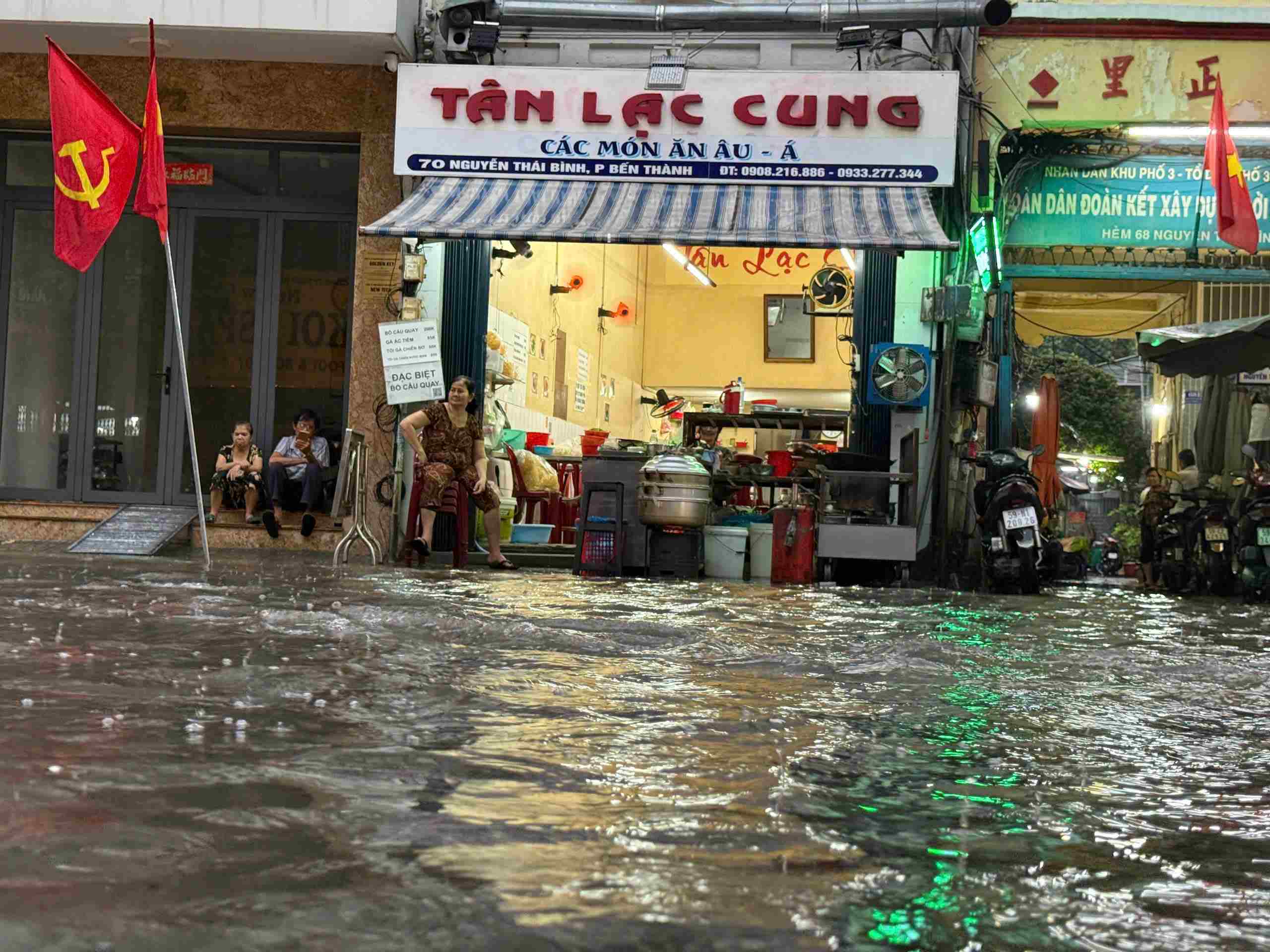 Theo ghi nhận của KTSG Online, một đoạn đường dài gần 1km trên đường Nguyễn Thái Bình (quận 1 cũ) chìm trong nước sau cơn mưa kéo dài chiều 8-10.