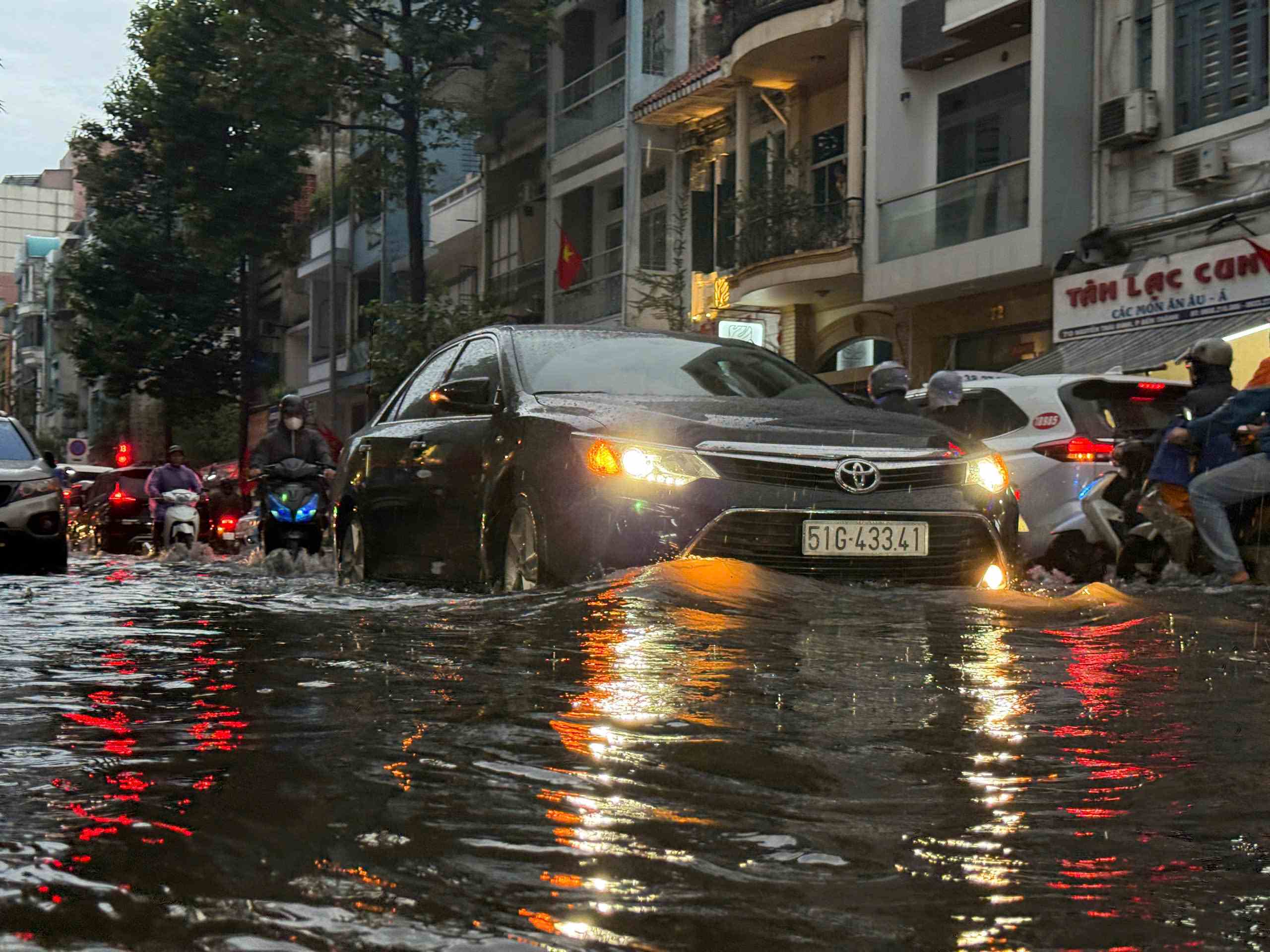 Khu vực Thảo Điền (quận 2 cũ) cũng lênh láng nước. Không ít xe máy bị tắt máy, phải dẫn bộ.