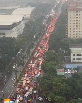 Từ trên cao nhìn xuống, tuyến đường Trịnh Văn Bô - Lê Quang Đạo (hướng về trung tâm thành phố) xảy ra ùn tắc kéo dài hàng kilomet, các phương tiện di chuyển hết sức khó khăn. (Ảnh: OFFB)