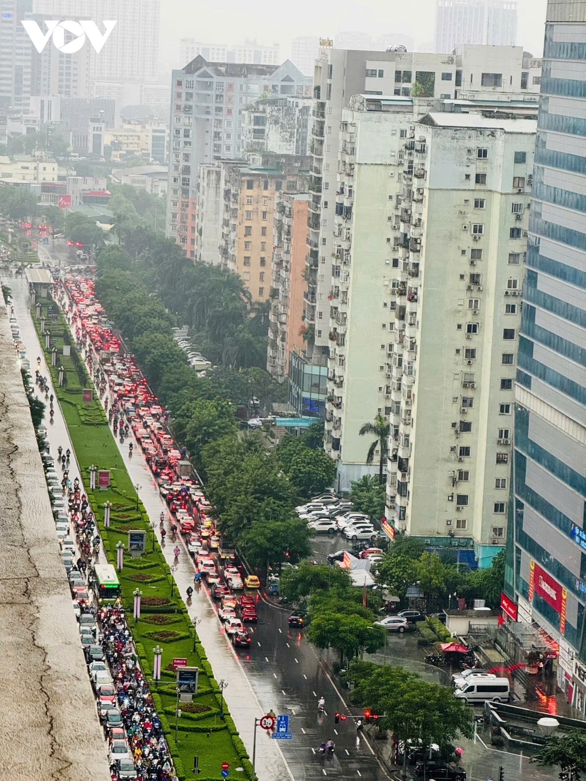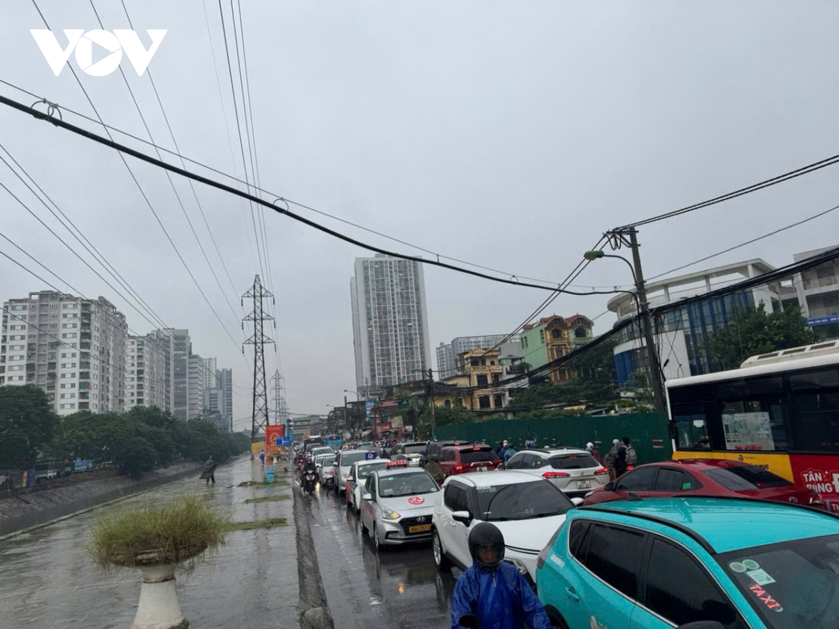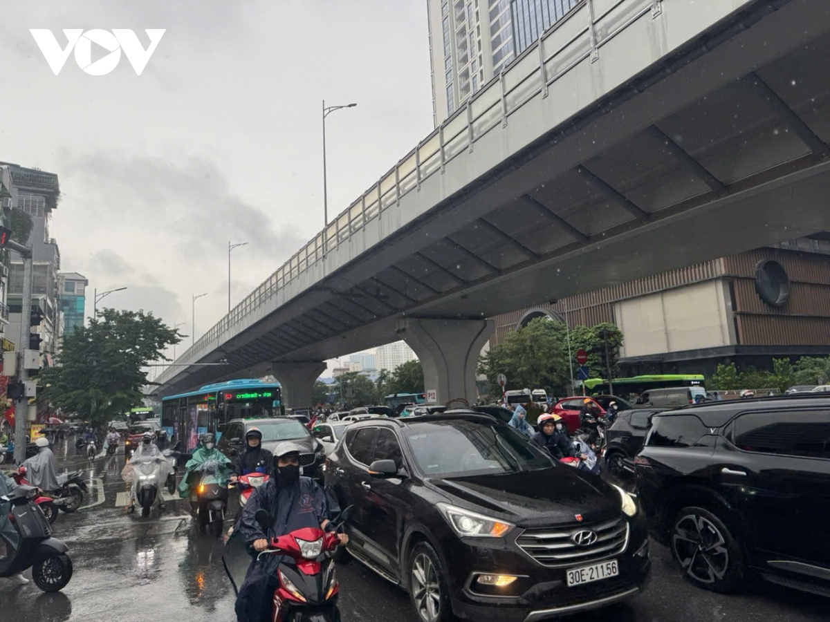 Tại khu vực đường Giảng Võ - Cát Linh, giao thông vốn đã thường xuyên ùn tắc vào giờ cao điểm. Sáng nay, mưa lớn khiến tình hình càng trở nên nghiêm trọng, đoạn ùn tắc kéo dài khoảng 1km.