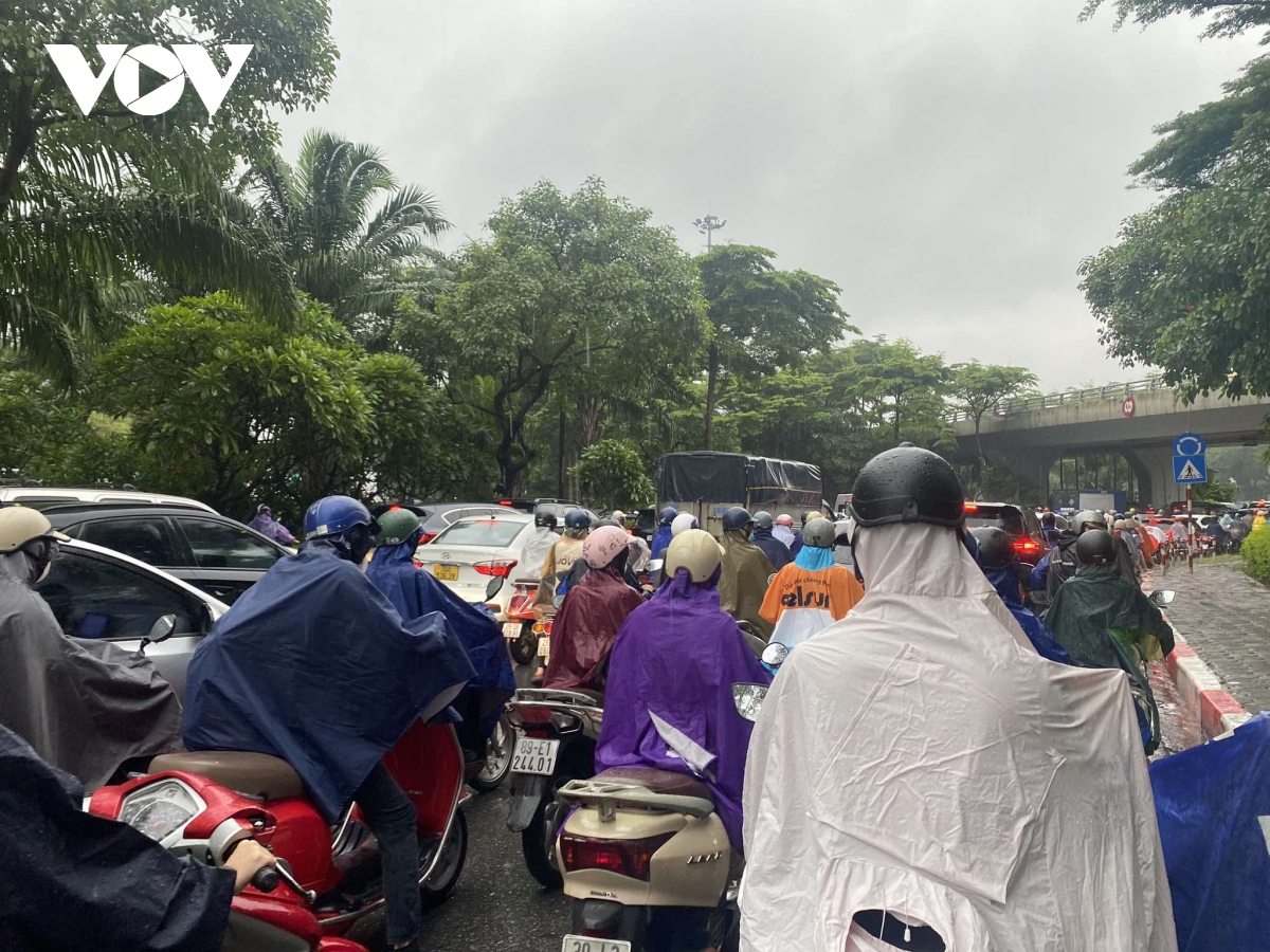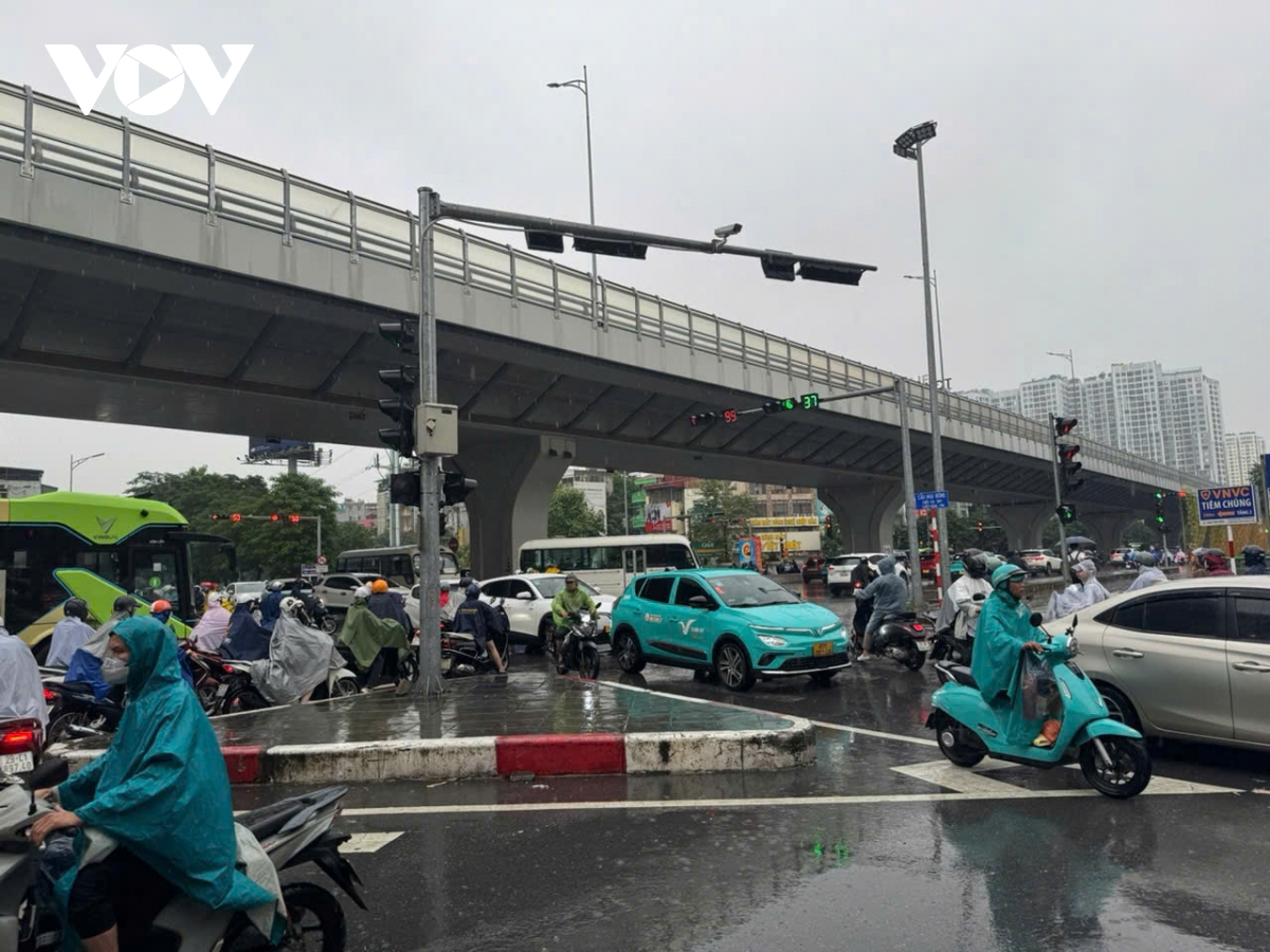 Trên tuyến đường Mỹ Đình - Lê Quang Đạo, mưa rào vào đầu giờ sáng khiến tầm nhìn của người tham gia giao thông bị hạn chế, gây khó khăn trong di chuyển. Giao thông tại khu vực này hiện khá hỗn loạn, các phương tiện di chuyển lộn xộn, thiếu kiểm soát. (Ảnh: OFFB)