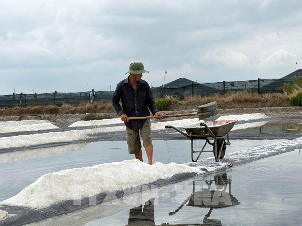 Thực tế cho thấy, chỉ cần một đến hai cơn mưa trái mùa cũng có thể làm tan toàn bộ lượng muối đang kết tinh, ảnh hưởng trực tiếp đến sản lượng và chất lượng sản phẩm. Vì vậy, vào cao điểm mùa nắng, diêm dân thường tranh thủ tối đa thời gian để dẫn nước biển vào ruộng, phơi kết tinh và thu hoạch theo hình thức cuốn chiếu. Sau mỗi lứa thu hoạch, bà con nhanh chóng xử lý nền bạt, san phẳng mặt ruộng để chuẩn bị cho lứa tiếp theo, nhằm tận dụng từng ngày nắng.
