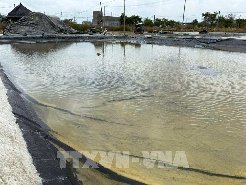 Ruộng muối trải bạt tại xã Long Điền (Thành phố Hồ Chí Minh) ngập trong nước mưa khiến muối tan thành nước. Ảnh: Hoàng Nhị - TTXVN