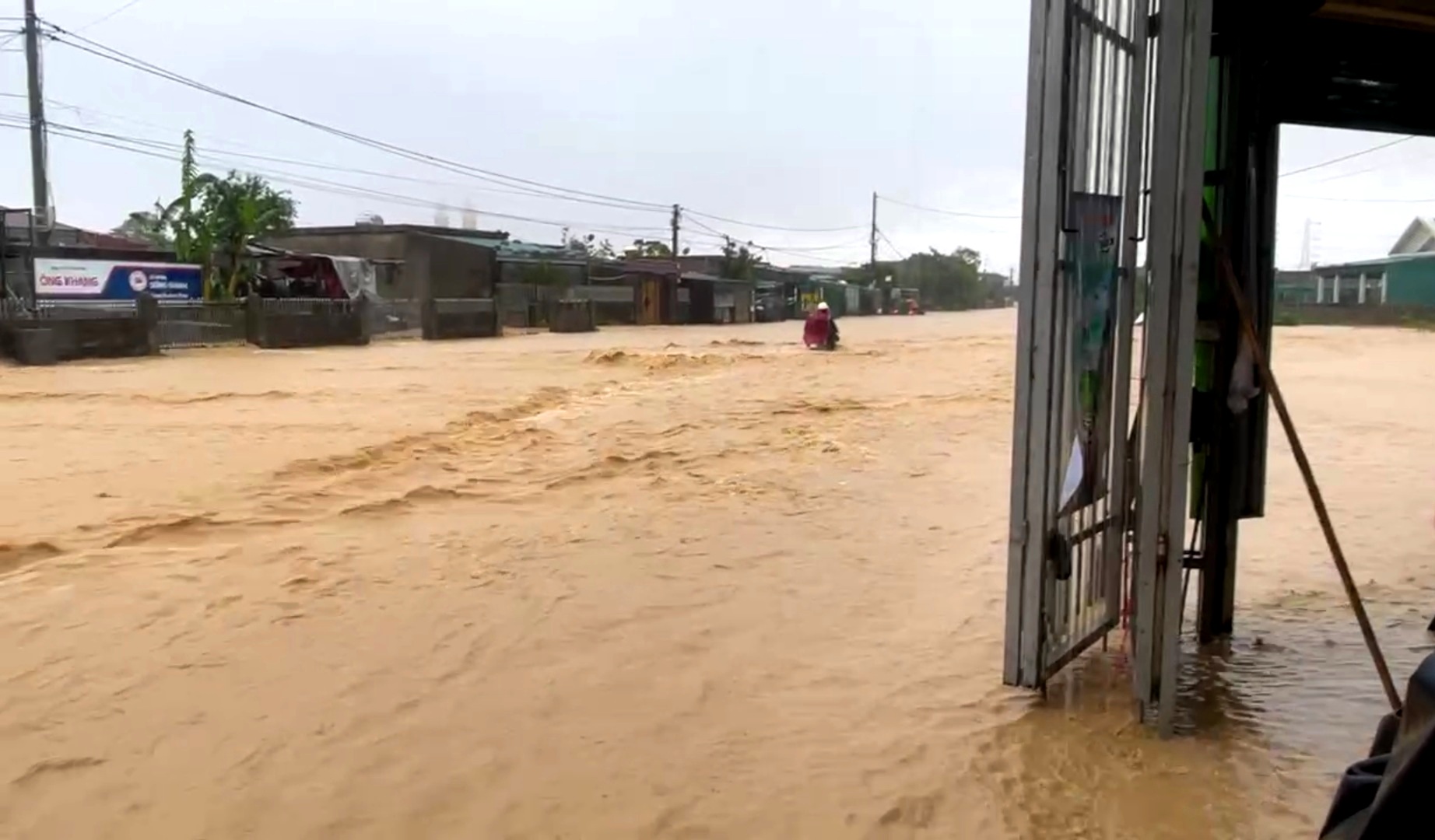 Mưa lớn kéo dài khiến tuyến đường tại phường Vũng Áng ngập, nước đục ngầu, chảy xiết