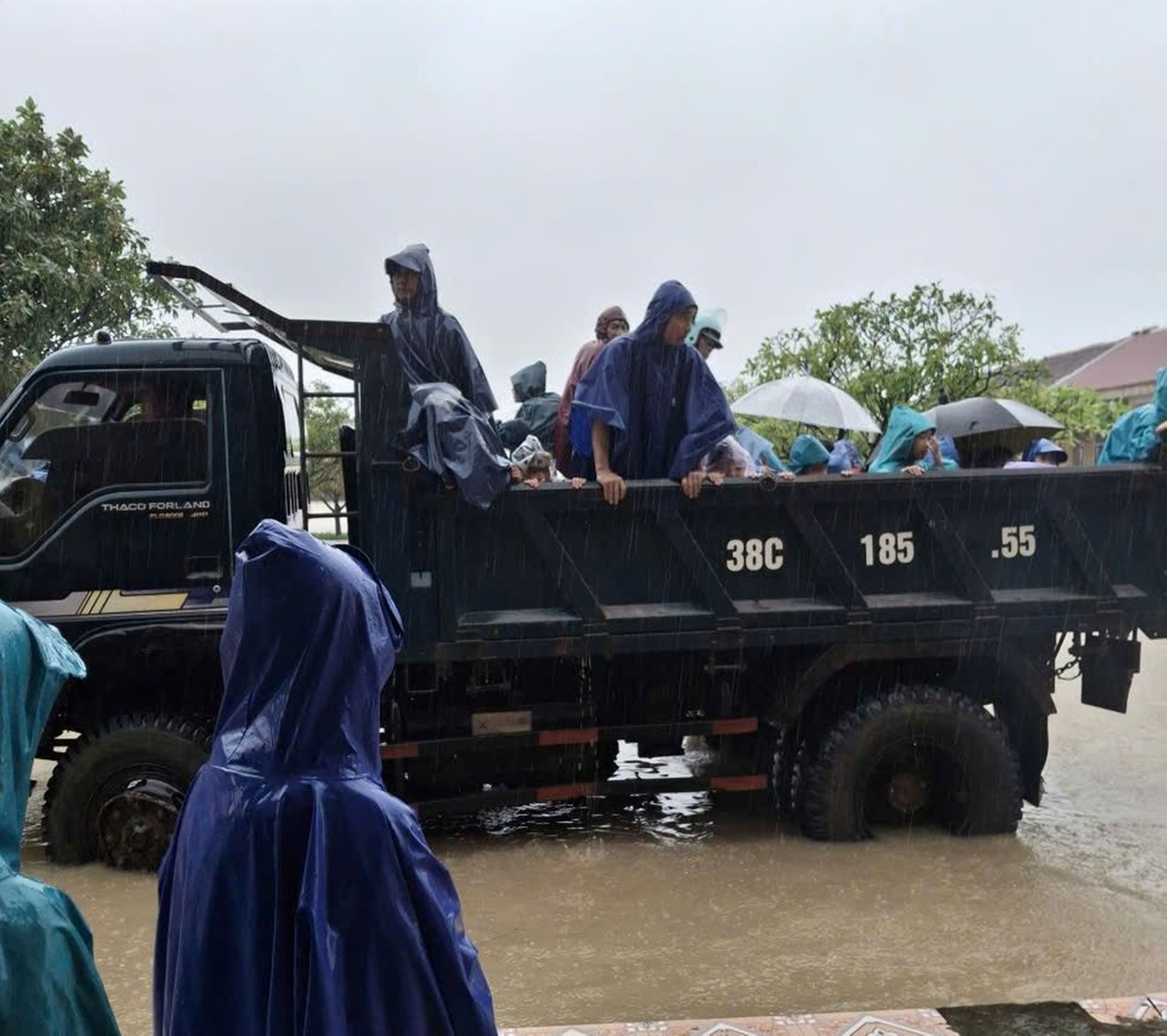 Dùng xe tải chở các em học sinh từ Trường Tiểu học Kỳ Thịnh - điểm trường ở Tây Yên (phường Vũng Áng) để về nhà phòng tránh mưa lũ