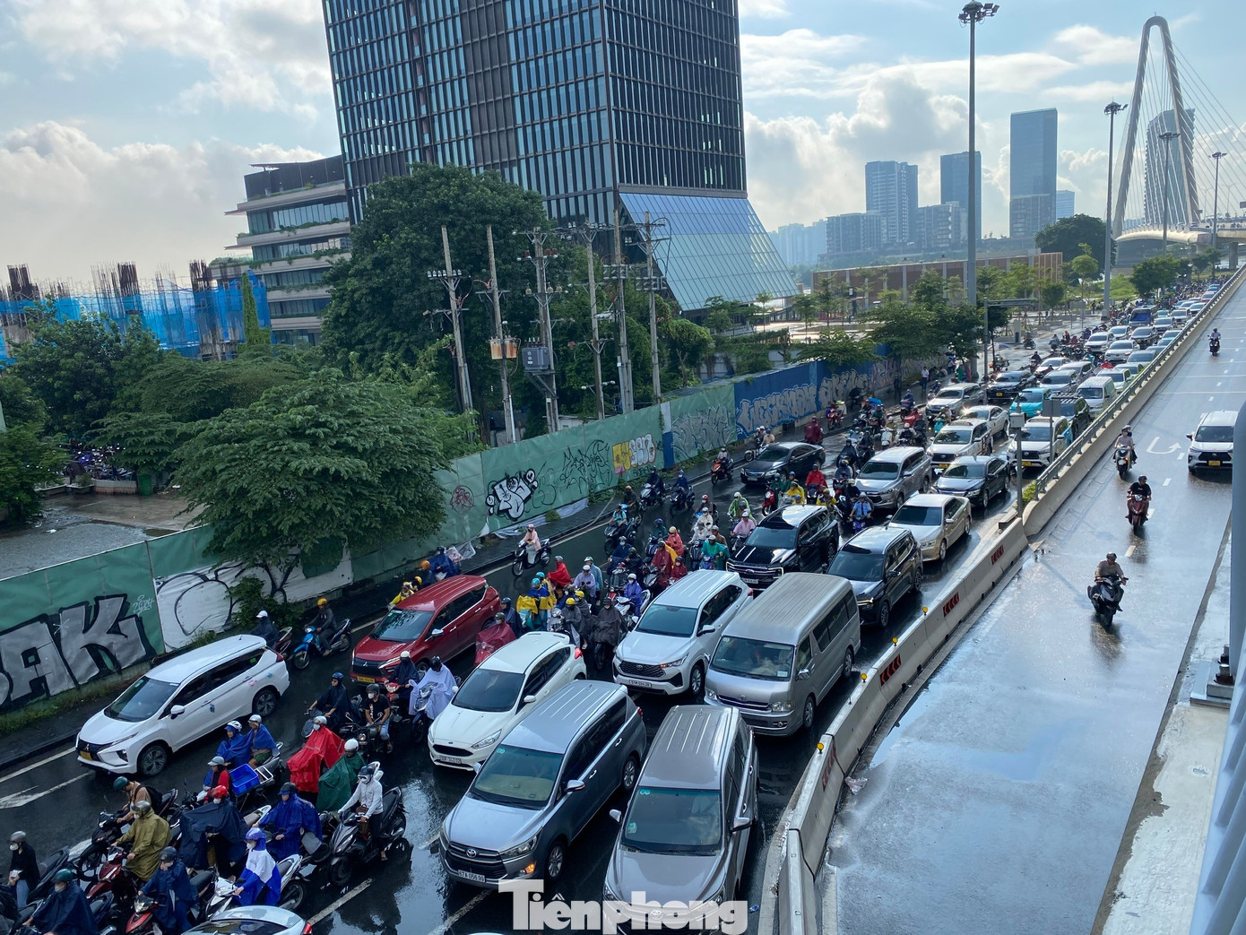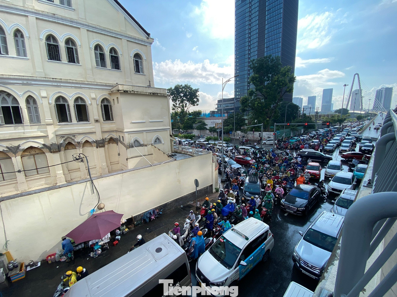 Sau cơn mưa, hàng loạt tuyến đường như Nguyễn Tất Thành (kết nối khu Nam với trung tâm), Nguyễn Hữu Cảnh, Tôn Đức Thắng, Đinh Tiên Hoàng,... và khu vực cầu Ba Son rơi vào tình trạng ùn ứ cục bộ. Hình ảnh ghi nhận tại điểm giao giữa đường Tôn Đức Thắng - Nguyễn Hữu Cảnh, phường Sài Gòn. Ảnh: Hữu Huy
