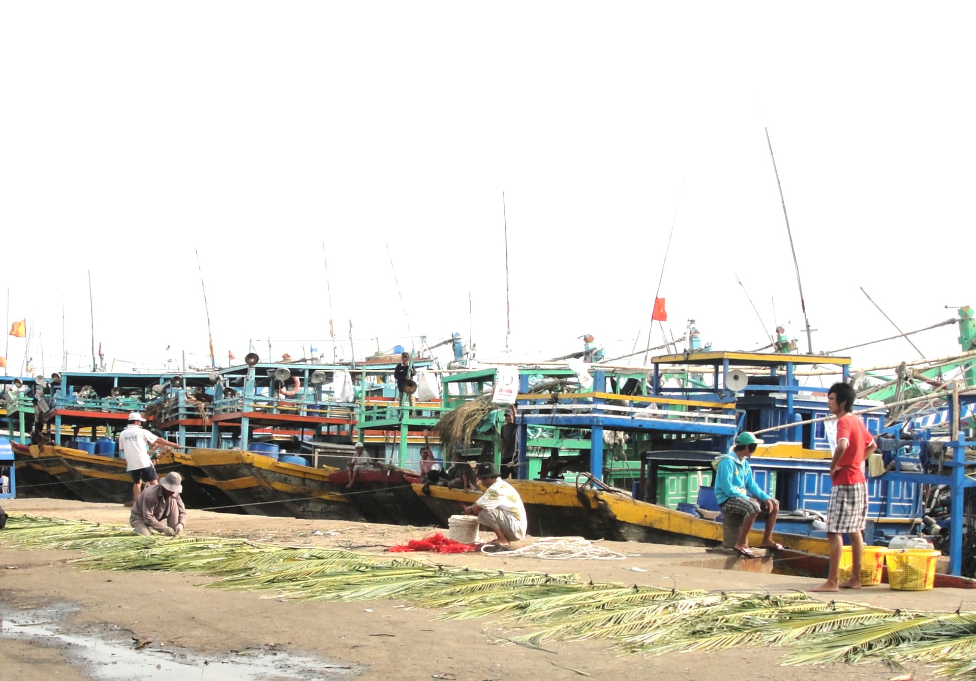 Khi chúng tôi đến, nhiều tàu dừa được tập kết trong khuôn viên bến cảng. Dù không ra khơi vì giá dầu tăng cao, ngư dân vẫn có mặt ở đây như một thói quen khó bỏ. Người lên tàu kiểm tra máy móc, người tỉ mỉ sơn lại viền tàu theo quy định.