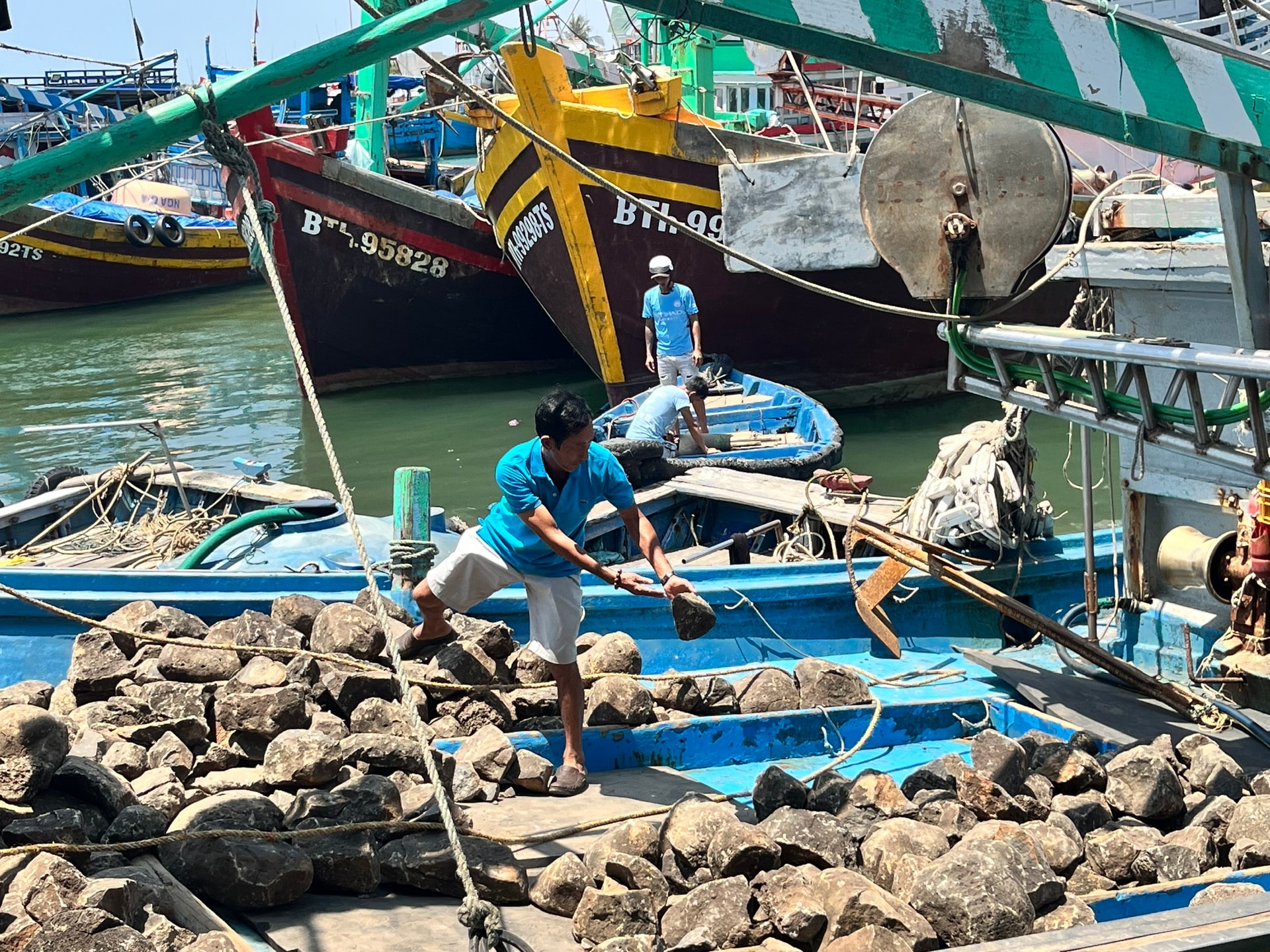 Cùng làm nghề lưới rút như ông Bình, chiếc tàu của ông Trương Thanh Hùng (thôn Hải Tân 3) đậu sát bên cũng đang tất bật vận chuyển đá chẻ xuống tàu. Chỉ ít ngày nữa, khi việc kết tàu dừa hoàn tất, ông sẽ đưa chà ra khơi, thả theo những tọa độ đã quen thuộc.