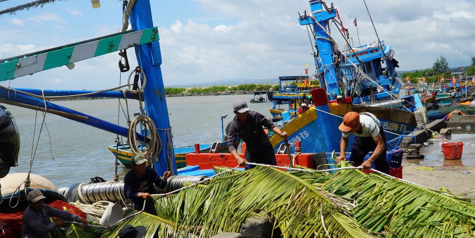 Ở một góc khác, vài nhóm ngư dân đang tranh thủ “cột chà”. Người kết lá, buộc vào thân tre; người khiêng đá chẻ làm rọ… Mỗi người một việc, thoăn thoắt, nhịp nhàng. Những động tác quen tay ấy đã theo họ suốt hàng chục năm làm nghề, lặng lẽ chuẩn bị cho một mùa biển mới.