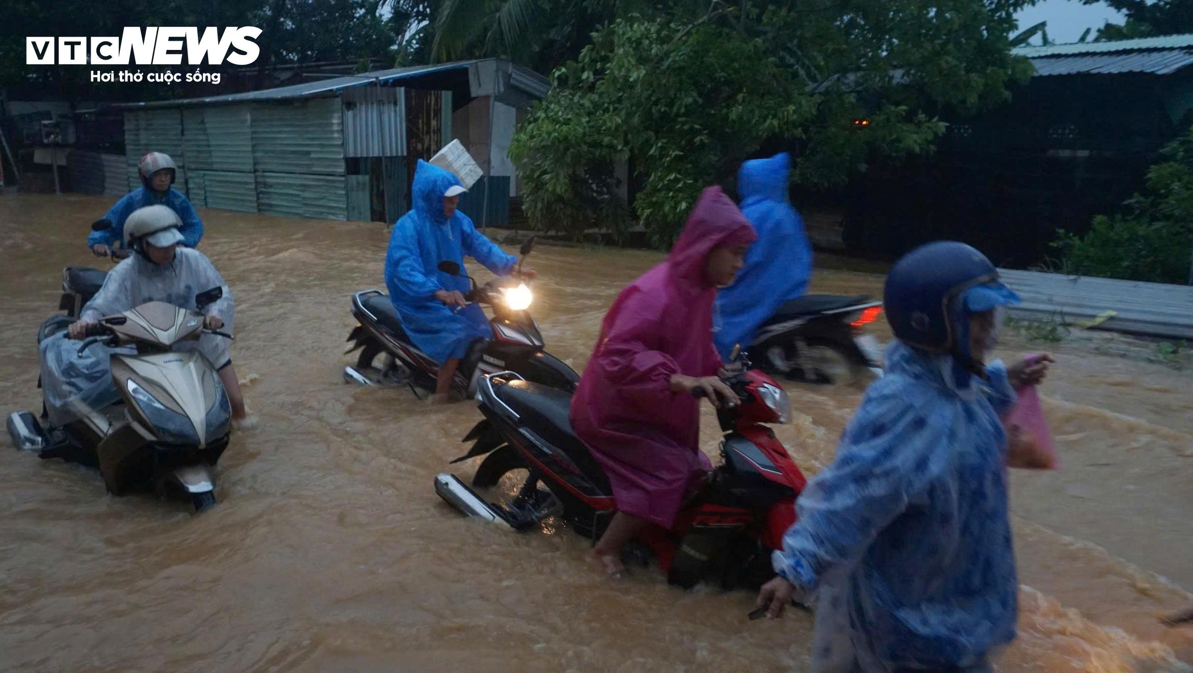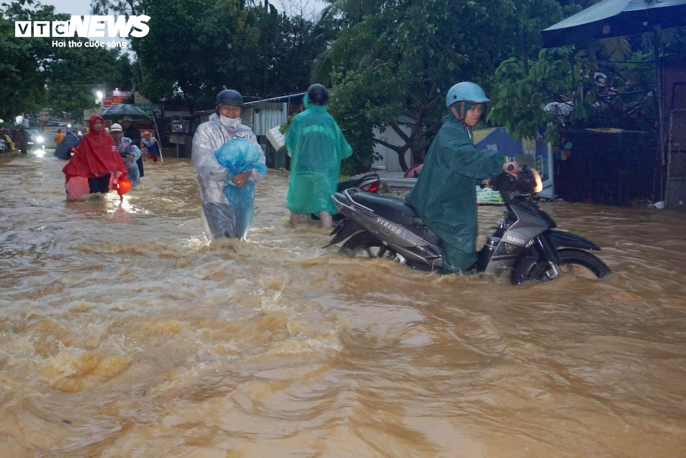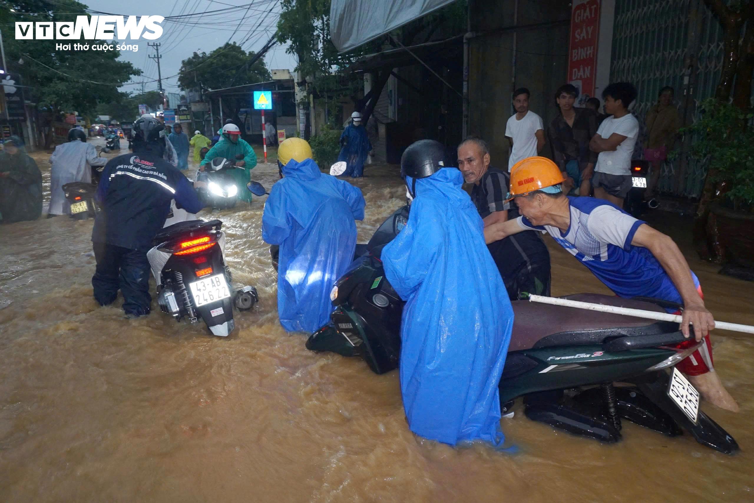 Hàng trăm xe máy chết máy giữa dòng, người dân phải bì bõm dắt bộ qua đoạn nước chảy xiết.