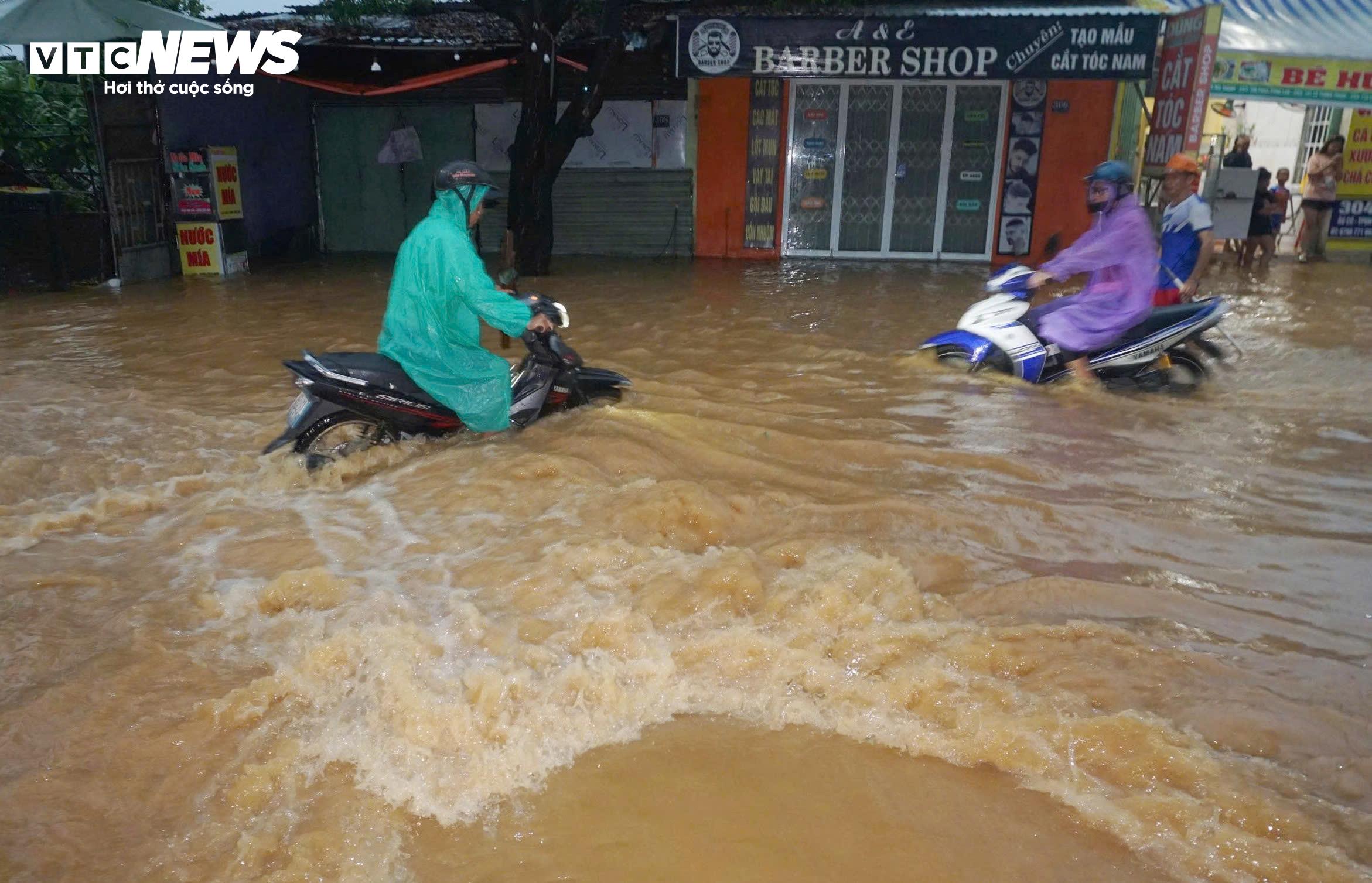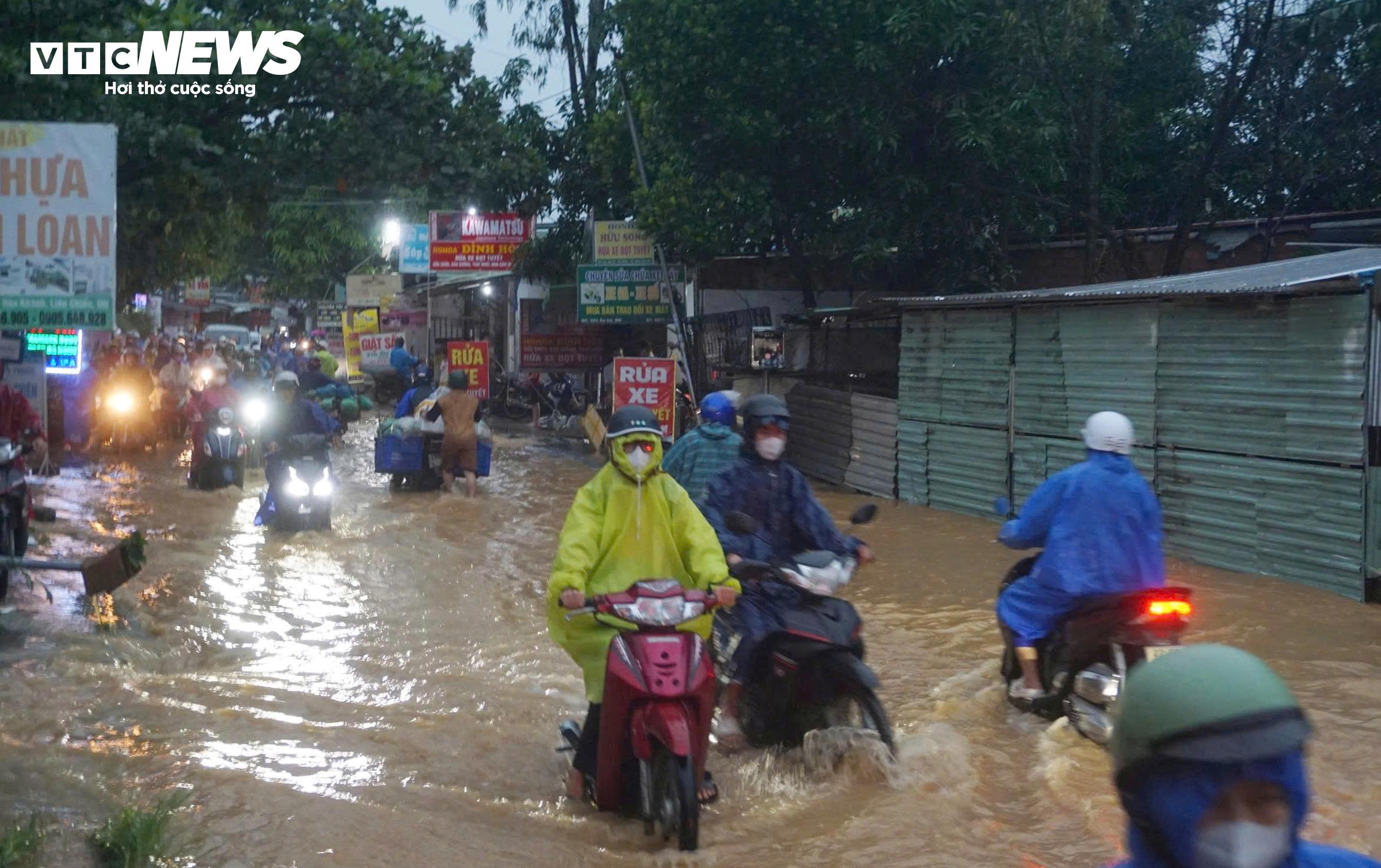 Tại khu vực gần chợ Thanh Vinh (đường Âu Cơ), mực nước có nơi ngập hơn 0,5m, dòng chảy xiết khiến việc đi lại của người dân gặp nhiều khó khăn.