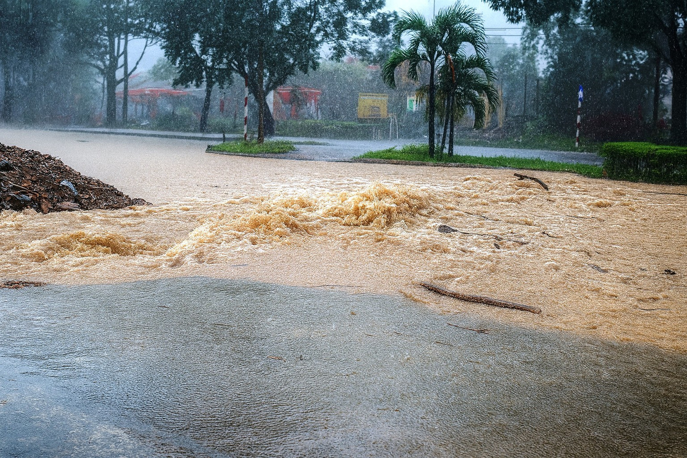 Nước chảy xiết trên đường Hồ Chí Minh do mưa rất lớn kéo dài.