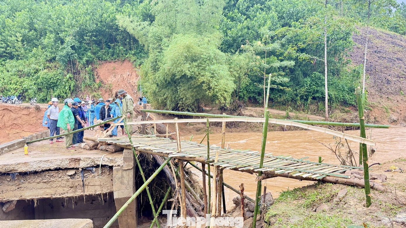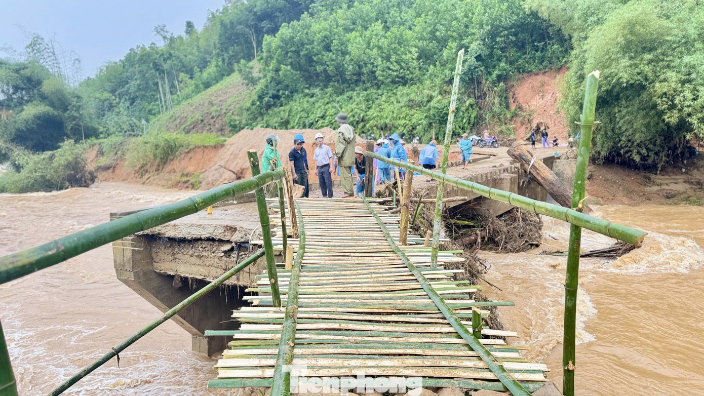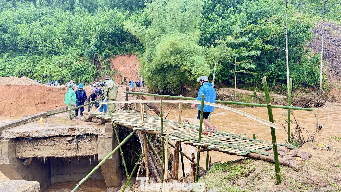 Cầu Nước Bao bị sập, lực lượng địa phương và người dân đã dùng tre để dựng tạm cầu.
