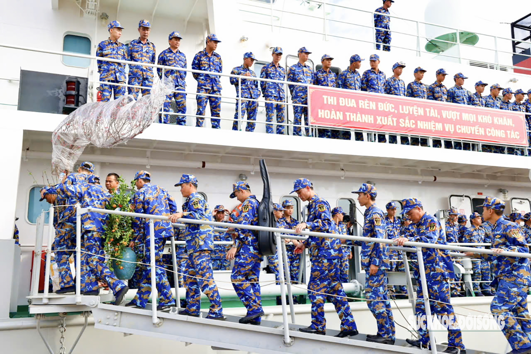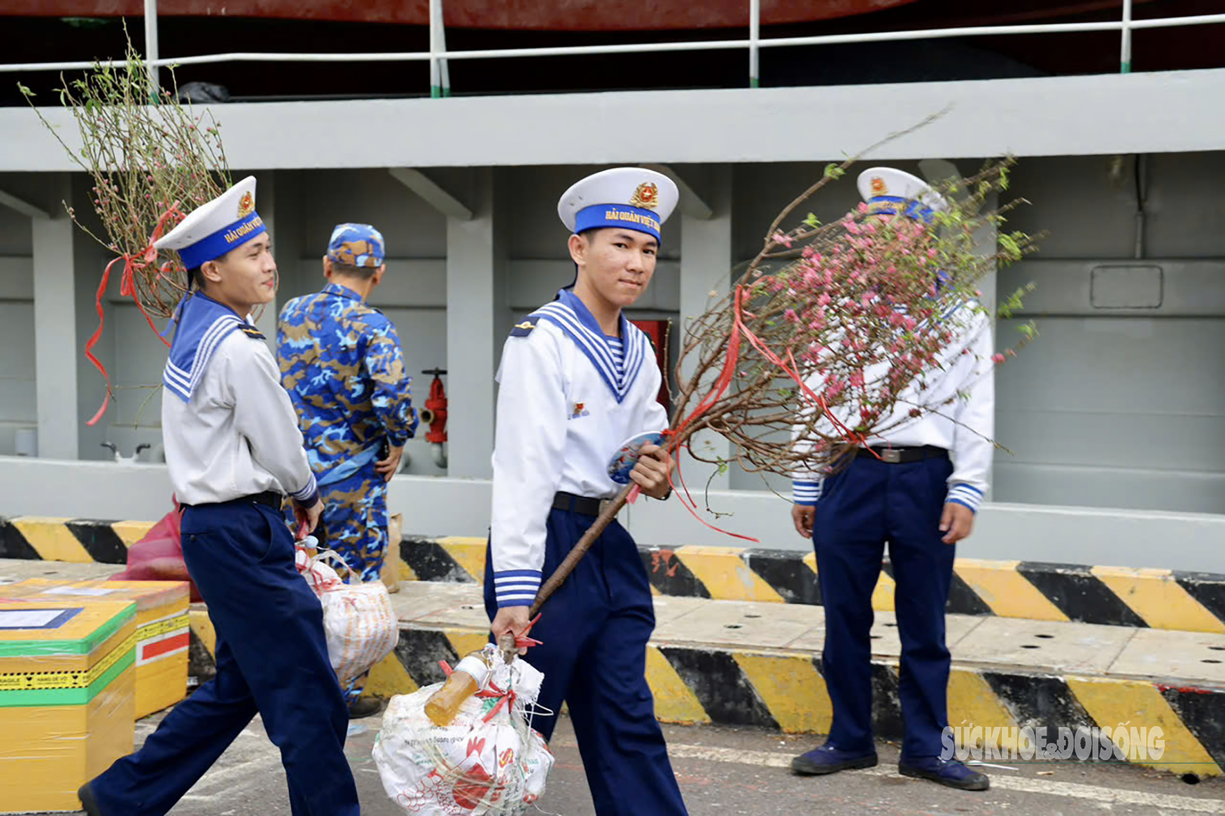 Cán bộ, chiến sĩ Hải quân khẩn trương vận chuyển cành đào và nhu yếu phẩm từ bến lên tàu trước giờ khởi hành.