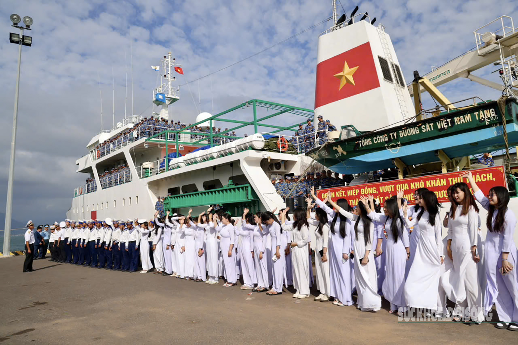Lễ tiễn đoàn công tác diễn ra tại cảng, lực lượng tham gia và các đại biểu xếp vẫy chào tiễn tàu mang "mùa xuân" ra đảo xa.