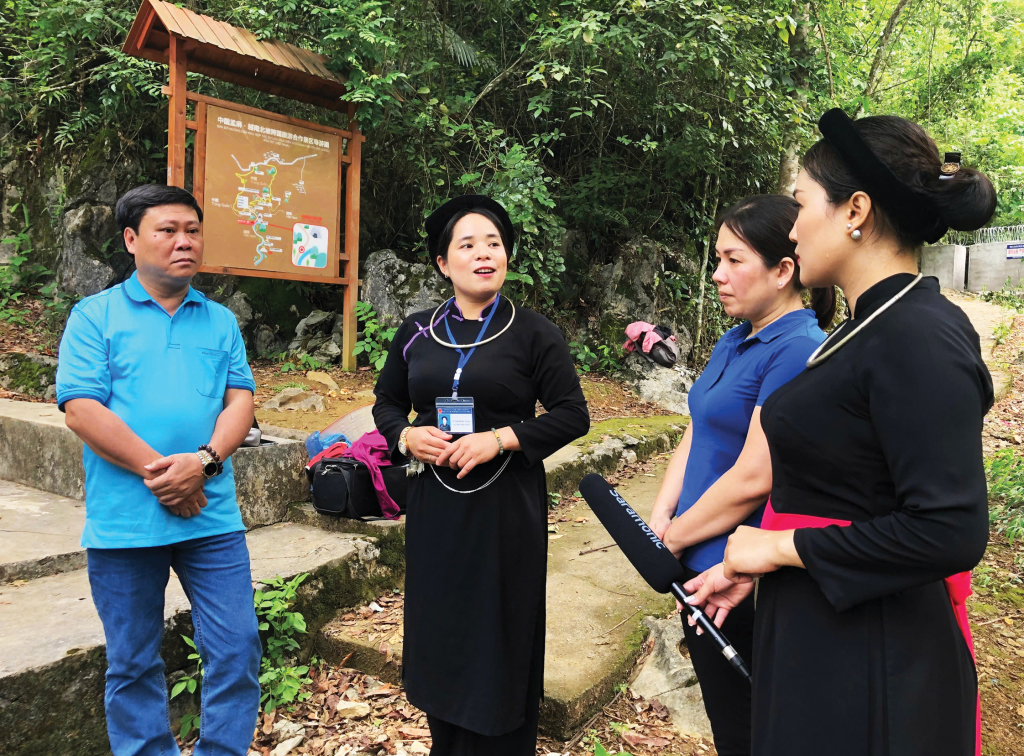 Chị Vi Thị Hồng Thoa (cháu ngoại của bà Hoàng Thị Khìn, Lão thành cách mạng tại bản Pác Bó), hướng dẫn viên Khu di tích Quốc gia đặc biệt Pác Bó thuyết minh, kể lại những ngày lãnh tụ Nguyễn Ái Quốc và cán bộ cách mạng trở về Tổ quốc tại cột mốc 108, Pác Bó, xã Trường Hà.