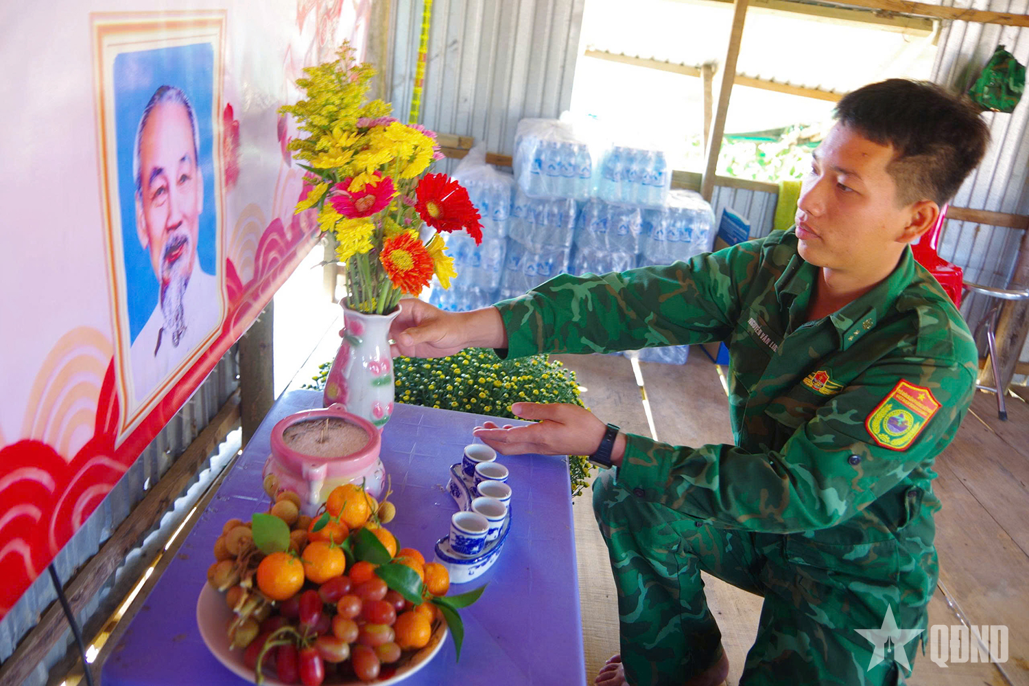 Bàn thờ Bác Hồ được trang trí trang nghiêm tại chốt, thể hiện lòng thành kính và quyết tâm hoàn thành tốt nhiệm vụ năm mới.