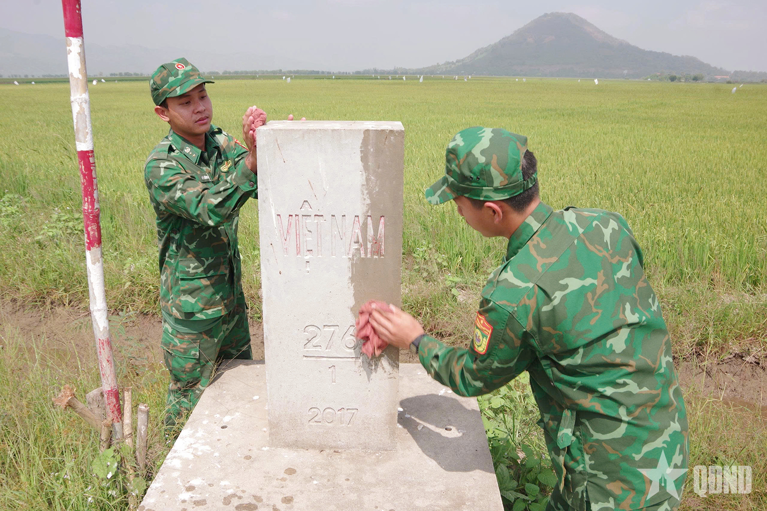Chiến sĩ Biên phòng kiểm tra, vệ sinh cột mốc chủ quyền.