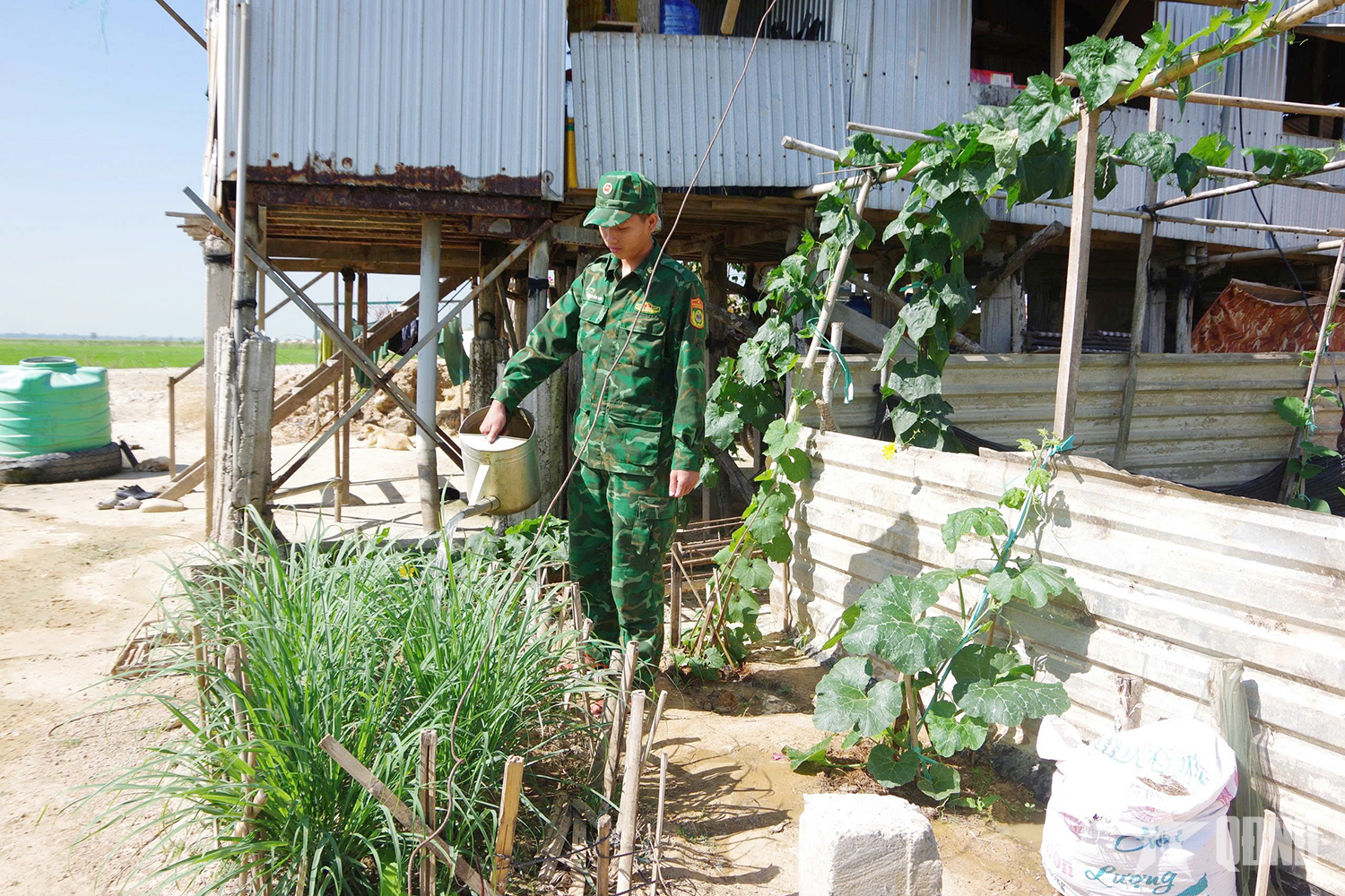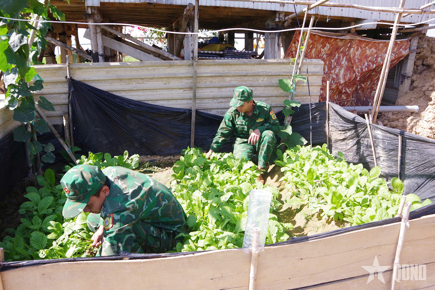 Cán bộ, chiến sĩ chăm sóc vườn rau tăng gia tại chốt, chuẩn bị nguồn thực phẩm cho bữa cơm ngày Tết.