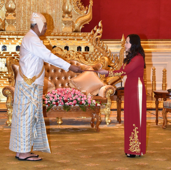 Tiến sĩ Luận Thùy Dương, với tư cách Đại sứ Việt Nam tại Myanmar trình Quốc thư của Chủ tịch nước Việt Nam lên Tổng thống Myanmar, năm 2016.