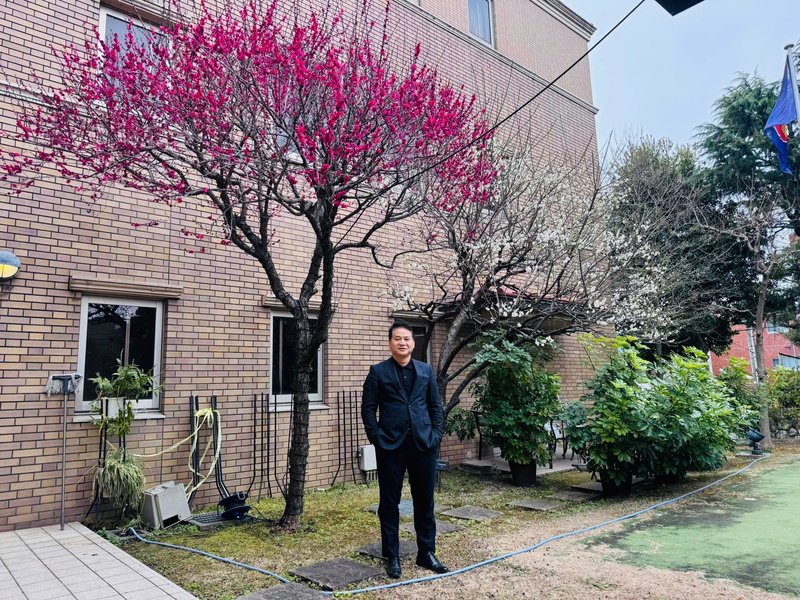 Tham tán thương mại Tạ Đức Minh chụp cùng cây hoa đào nở rộ đúng dịp Tết cổ truyền Việt Nam. Cây đào được trồng trong khuôn viên Đại sứ quán Việt Nam tại Nhật Bản.