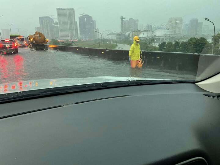 Trên đường vành đai 3 trên cao, nhiều chỗ nước ngập qua đầu gối công nhân môi trường (Ảnh: The Wheel)