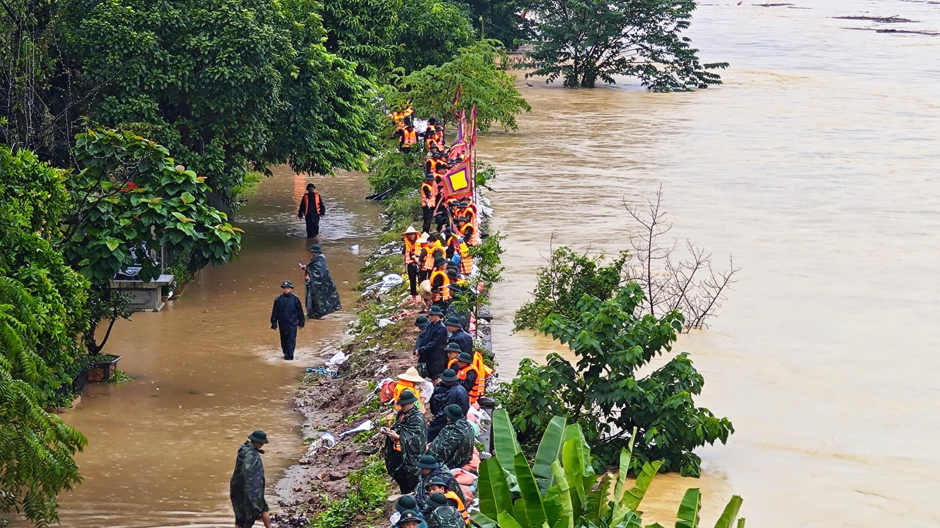 Bộ Chỉ huy Quân sự tỉnh Thái Nguyên cùng các lực lượng tham gia gia cố đê và trực đê Sông Cầu