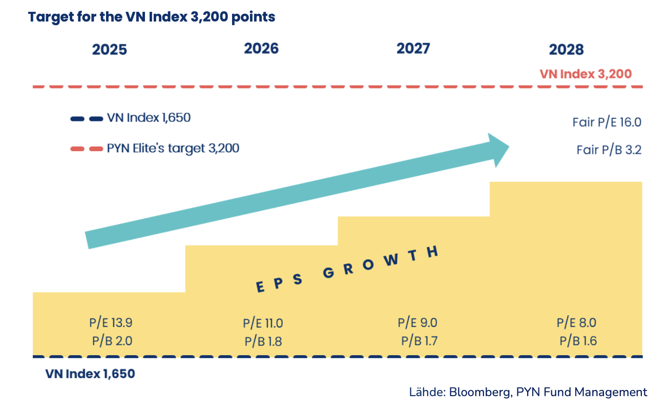 Còn ở thị trường Việt Nam, quỹ bắt đầu đầu tư khi chỉ số VN-Index ở quanh mức 480 điểm. Lúc đó, PYN Elite đã đặt mục tiêu cho chỉ số ở mức khiêm tốn là 1.200 điểm. Ông Petri Deryng thừa nhận: “Trong 5 năm đầu tiên, chúng tôi đã đánh giá thấp tiềm năng tăng trưởng của nền kinh tế Việt Nam. Vì vậy chúng tôi đã nâng mục tiêu chỉ số lên 1.800 điểm”. Vài năm trước, quỹ tiếp tục điều chỉnh mục tiêu lên 2.500 điểm và hiện, mục tiêu đối với VN-Index đã được nâng lên thêm một lần nữa ở mức 3.200 điểm.