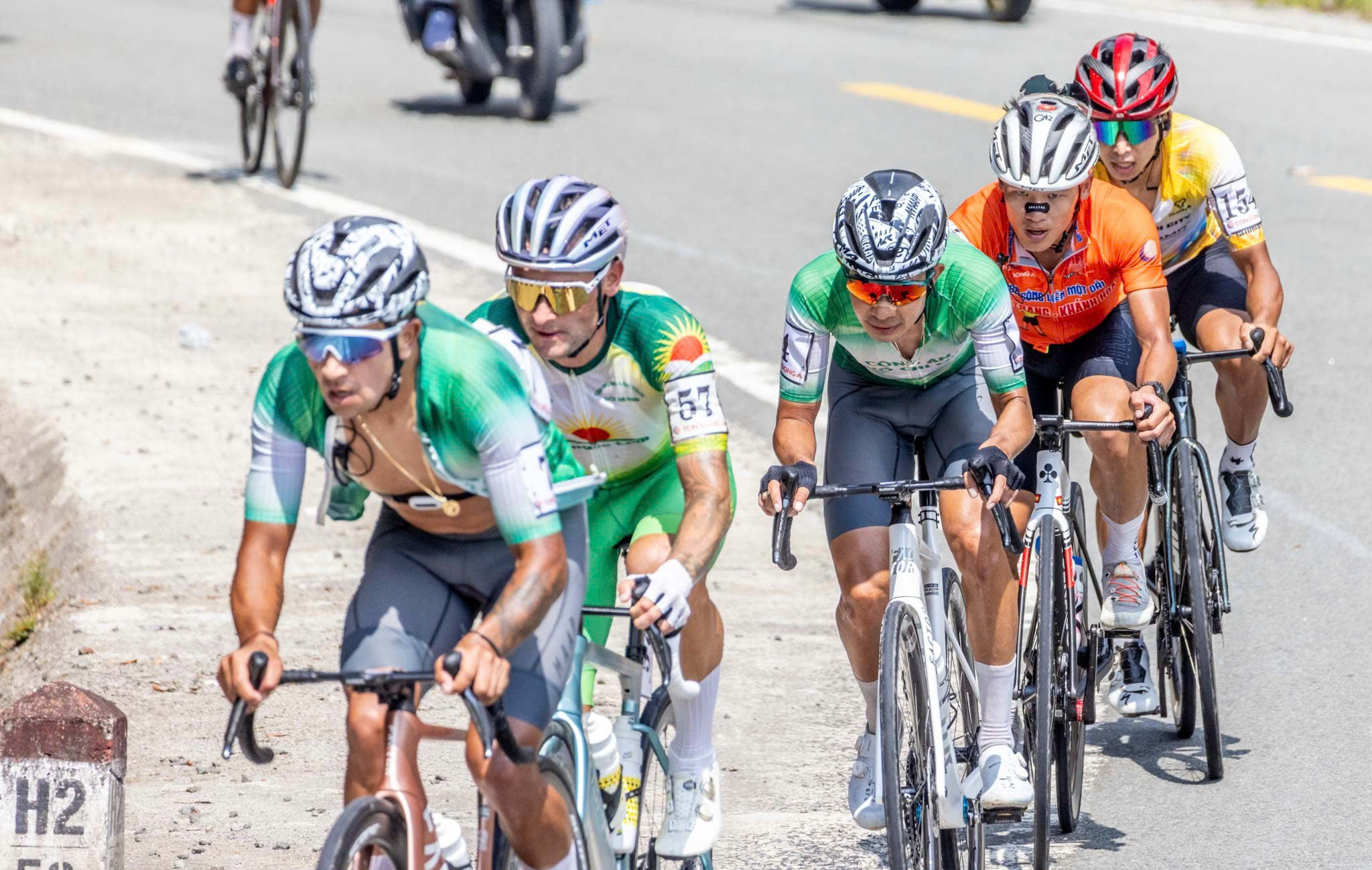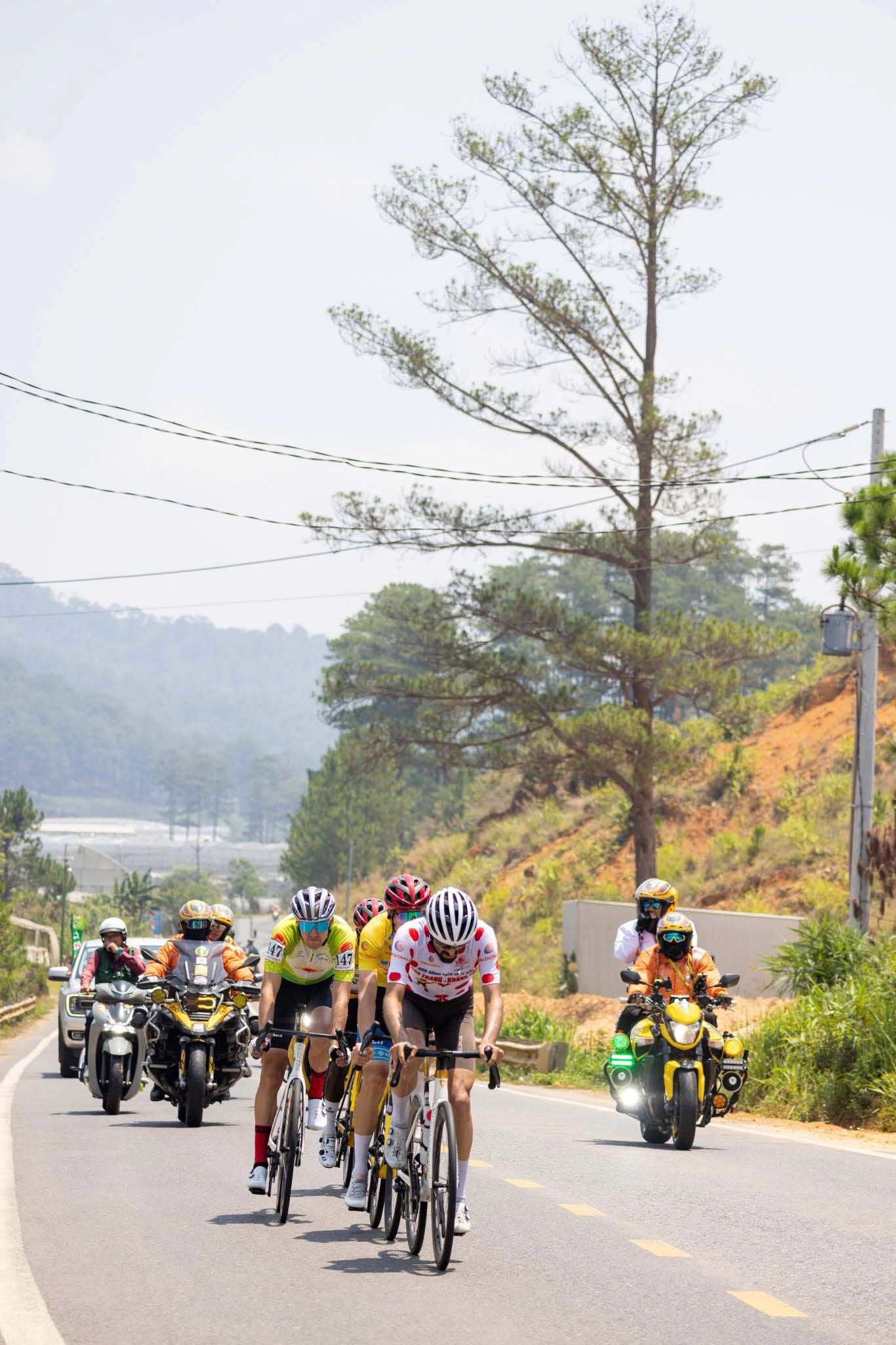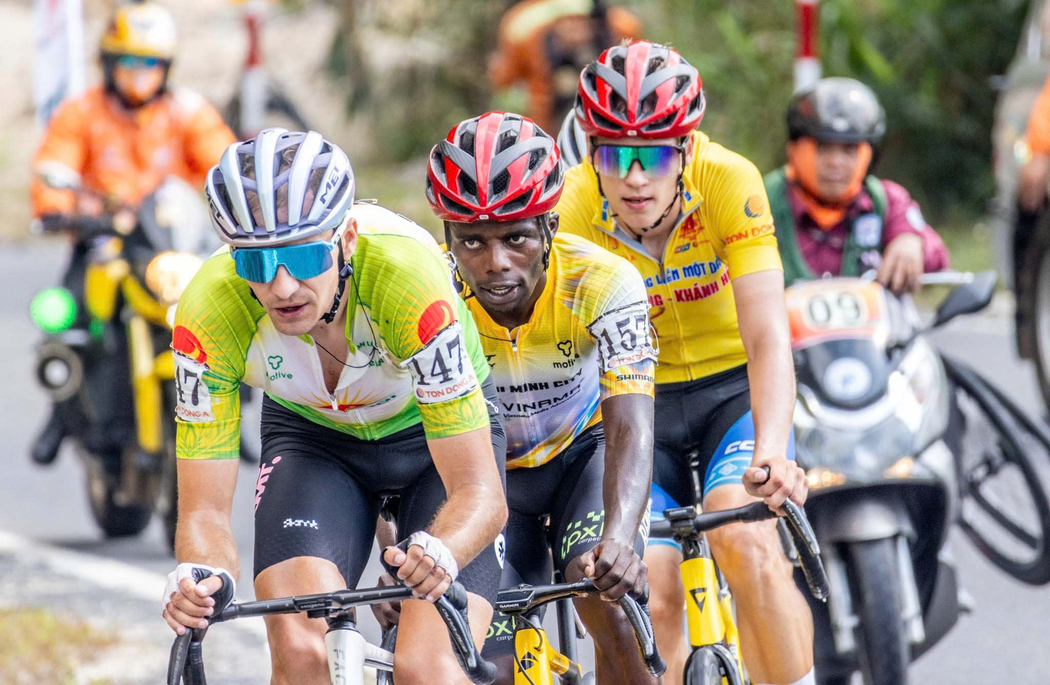Ngay từ những km đầu, các ngoại binh đã chủ động tung ra những đợt tấn công dồn dập nhằm vào áo vàng Yarash Uladzislau. Nhịp độ cao liên tục khiến đoàn đông nhanh chóng vỡ vụn khi bước vào những con dốc dài của đèo Khánh Lê. Trong bối cảnh đó, vai trò của các “chim mồi” và tay đua hỗ trợ - Moise trở nên đặc biệt quan trọng.