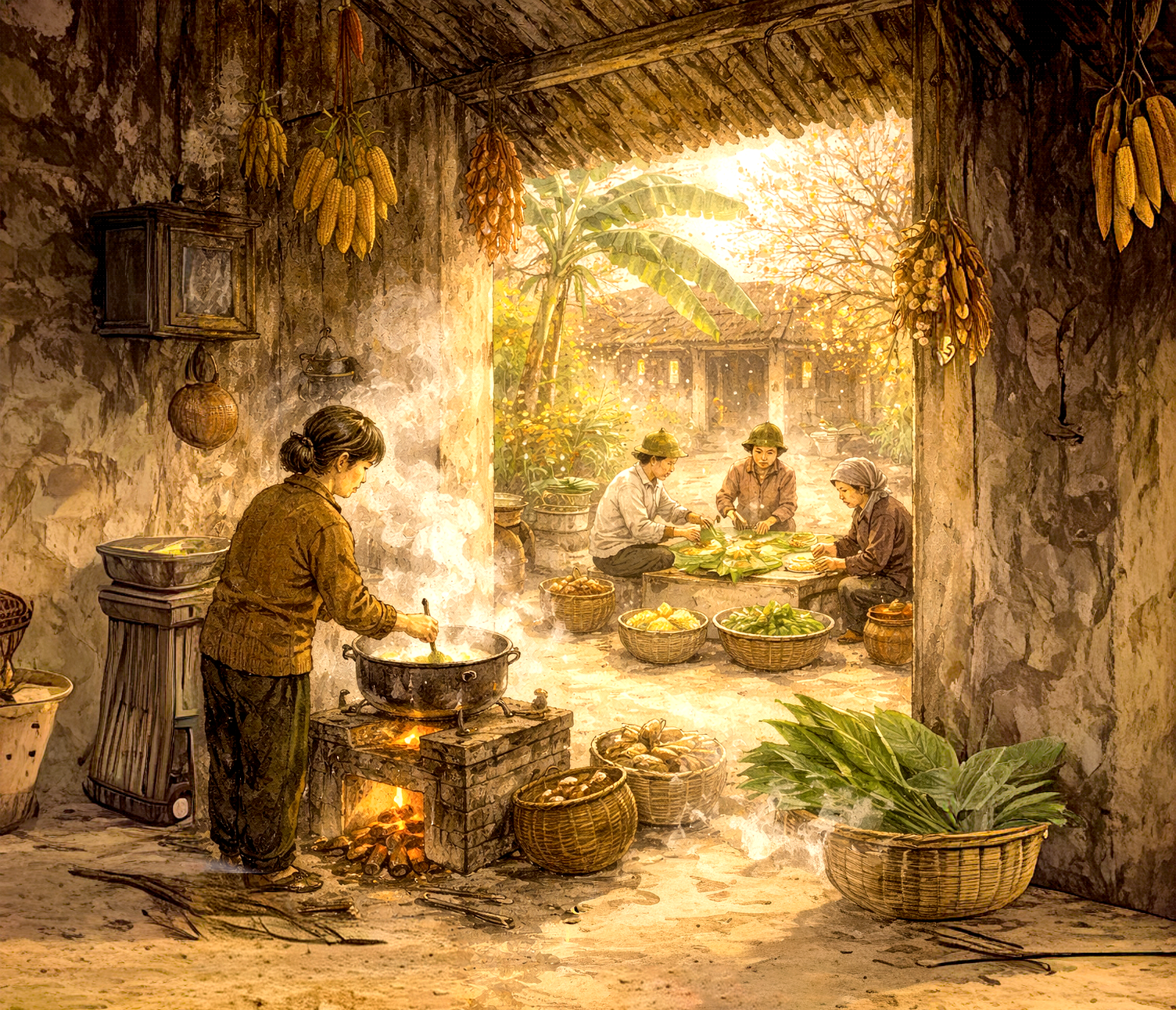 Ngoài sân, mùi lá chuối xanh hăng hắc lan trong gió lạnh. Cả nhà quây quần bên chồng lá vừa chặt ngoài vườn, rọc lá, lau lá, chuẩn bị gói bánh. Mùi nếp cái hoa vàng mới vo còn thơm mùi lúa, mùi đậu xanh đãi vỏ, mùi thịt heo được ướp kỹ bằng hành, tiêu, nước mắm… Tất cả quyện lại thành mùi của ruộng đồng, của đất đai, của một miền quê lam lũ mà hiền hòa. Đêm xuống, cả nhà thức canh nồi bánh. Khói bếp quyện hương bánh chín, lặng lẽ lan vào màn đêm, sưởi ấm cả một khoảng sân nhỏ.