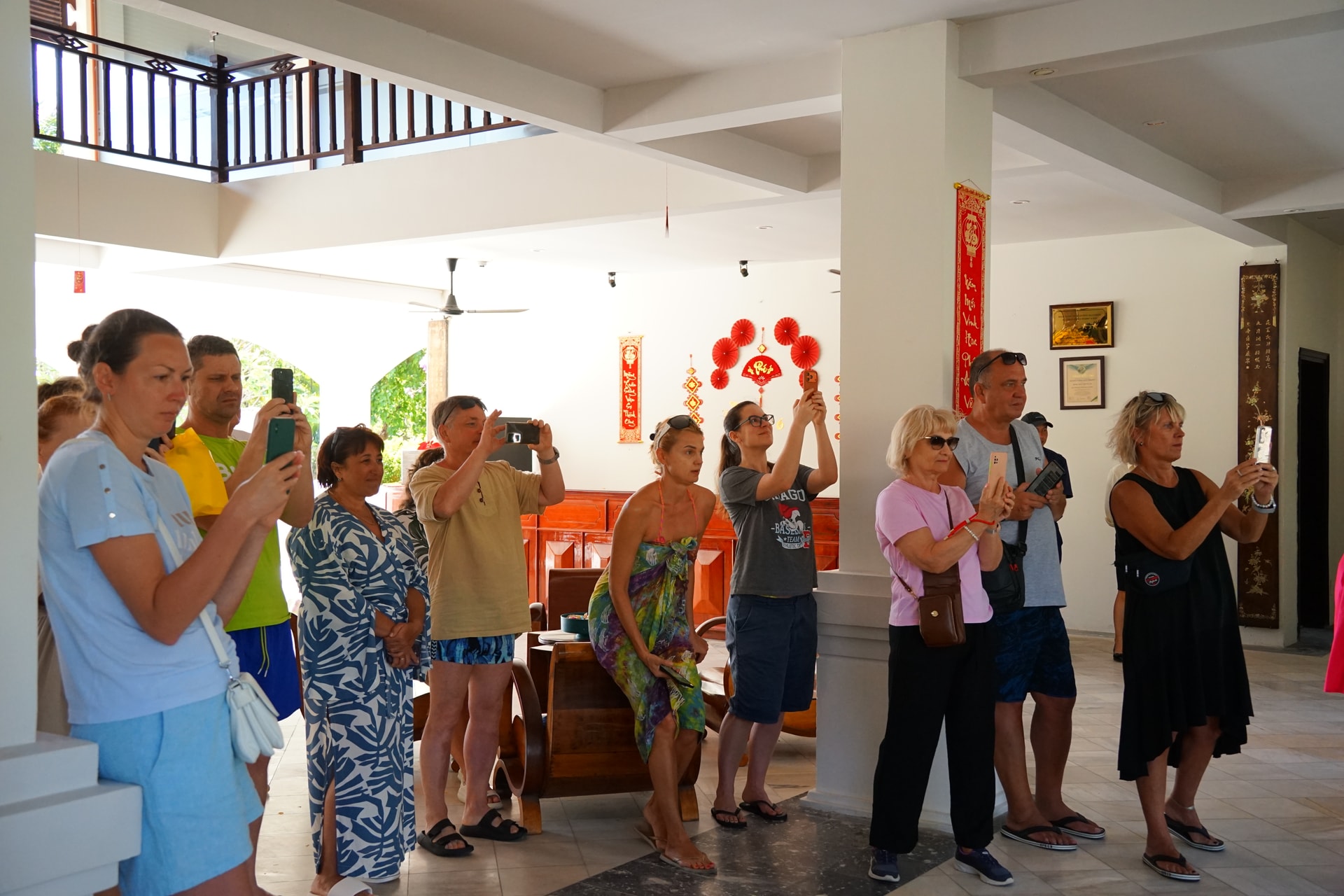 Du khách thích thú với màn biễu diễn lân sư rồng tại nơi lưu trú mùng 1 Tết Nguyên đán