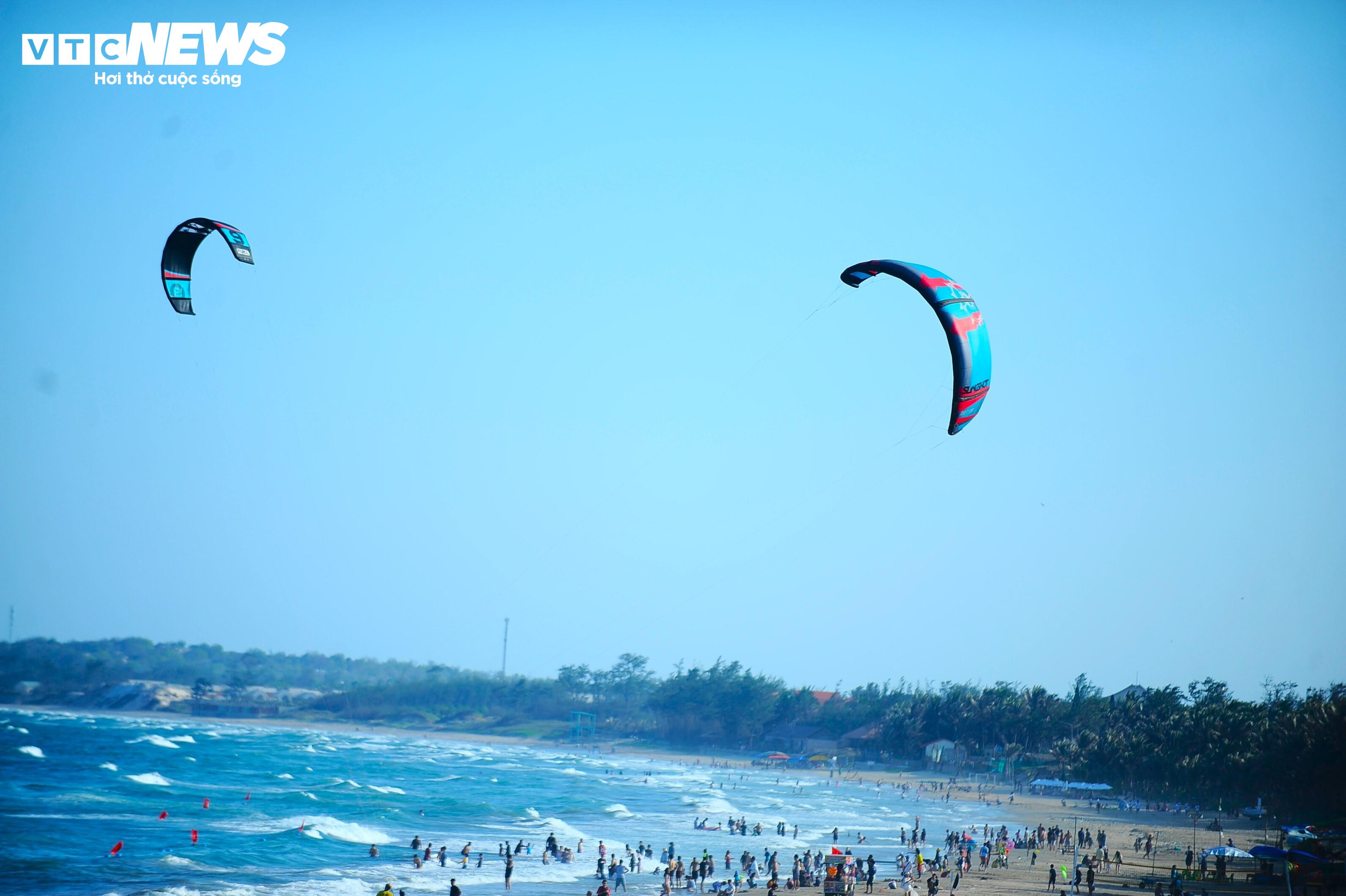 Một góc biển Mũi Né sôi động với bãi biển đẹp và trò chơi dù lượn hấp dẫn du khách.