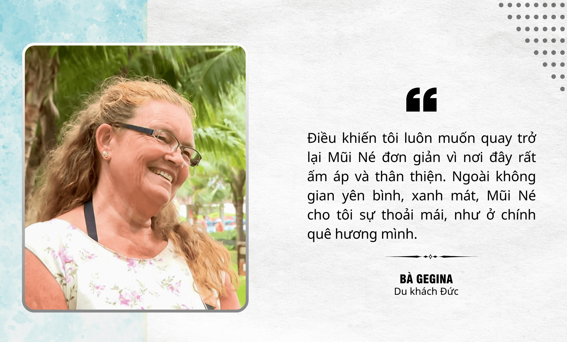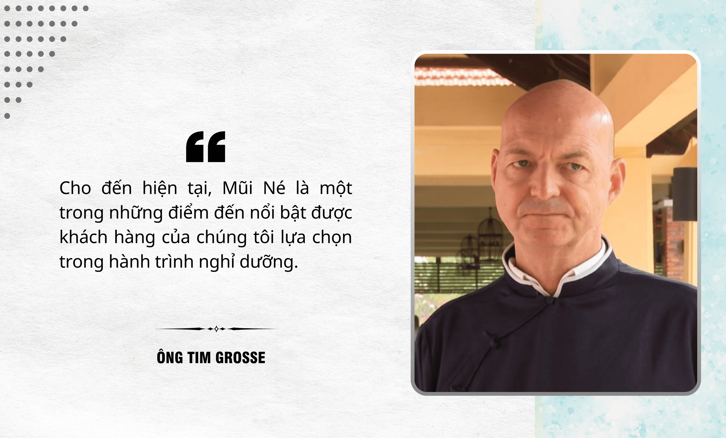 Ông Tim Grosse, Giám đốc vùng Việt Nam và Campuchia - Công ty lữ hành quốc tế Go Vacation Vietnam khẳng định: Mũi Né là điểm đến được nhiều khách hàng lựa chọn. Nơi đây có nhiều khách sạn tốt và các bãi biển thích hợp để nghỉ dưỡng quanh năm”.