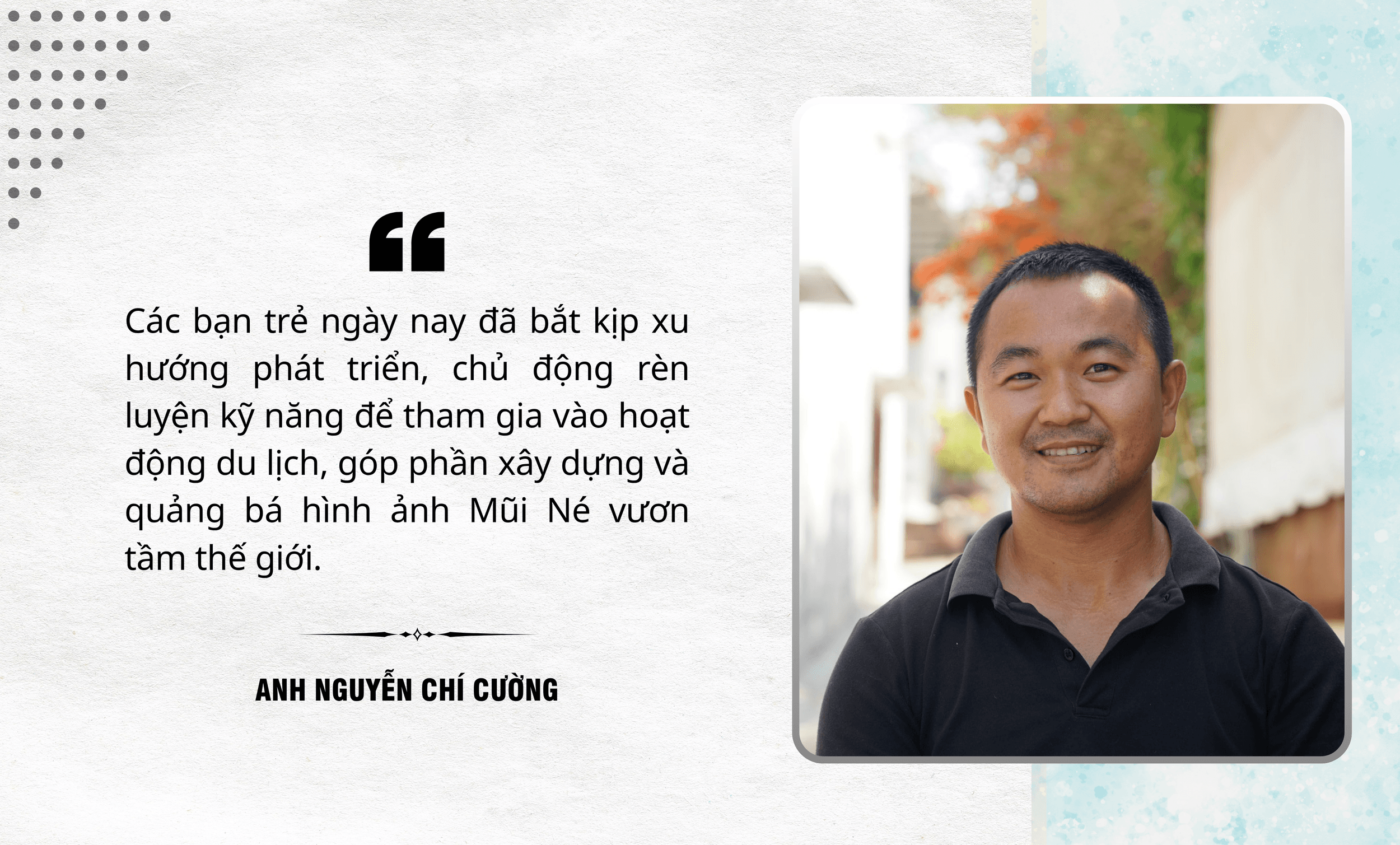 Anh Cường chia sẻ: Khi du lịch Mũi Né phát triển, tôi có 2 năm trải nghiệm thực tế, sau đó quyết định theo học để làm du lịch chuyên nghiệp. Tốt nghiệp, tôi có hơn 5 năm làm việc tại các resort 4 -5 sao, kể cả một số khu nghỉ dưỡng cao cấp ở Khánh Hòa.