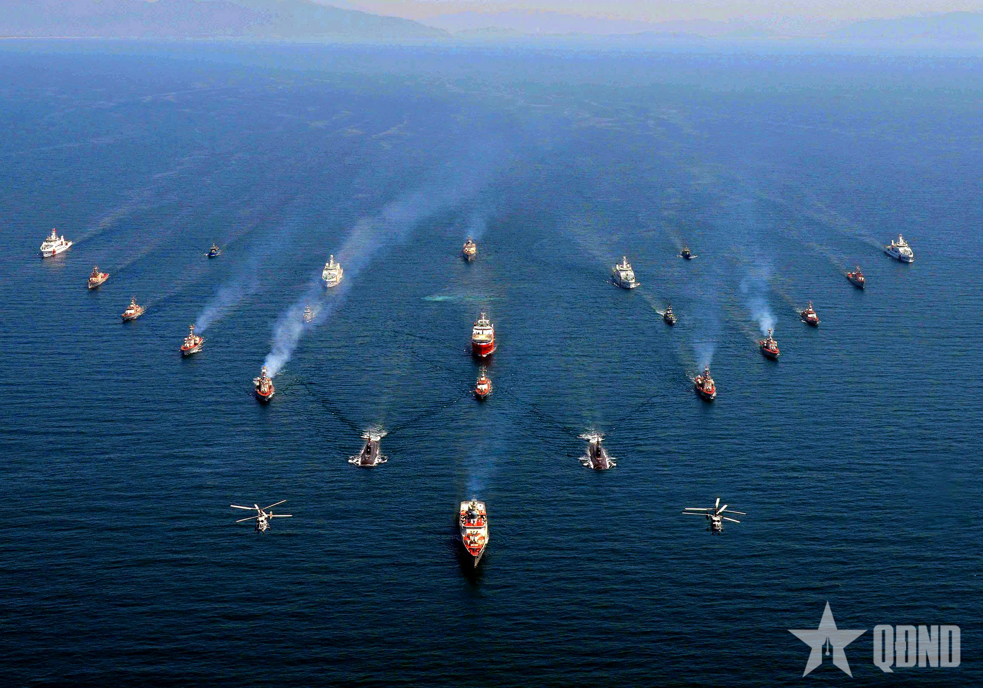 Đội hình chữ A được sắp xếp chuẩn xác đến từng vị trí. Những con tàu hiện đại, với lá cờ đỏ sao vàng tung bay trên đài chỉ huy, đồng loạt giữ tốc độ ổn định, tạo nên một mũi nhọn uy lực hướng ra khơi xa - biểu tượng của ý chí bảo vệ chủ quyền biển, đảo thiêng liêng của Tổ quốc.